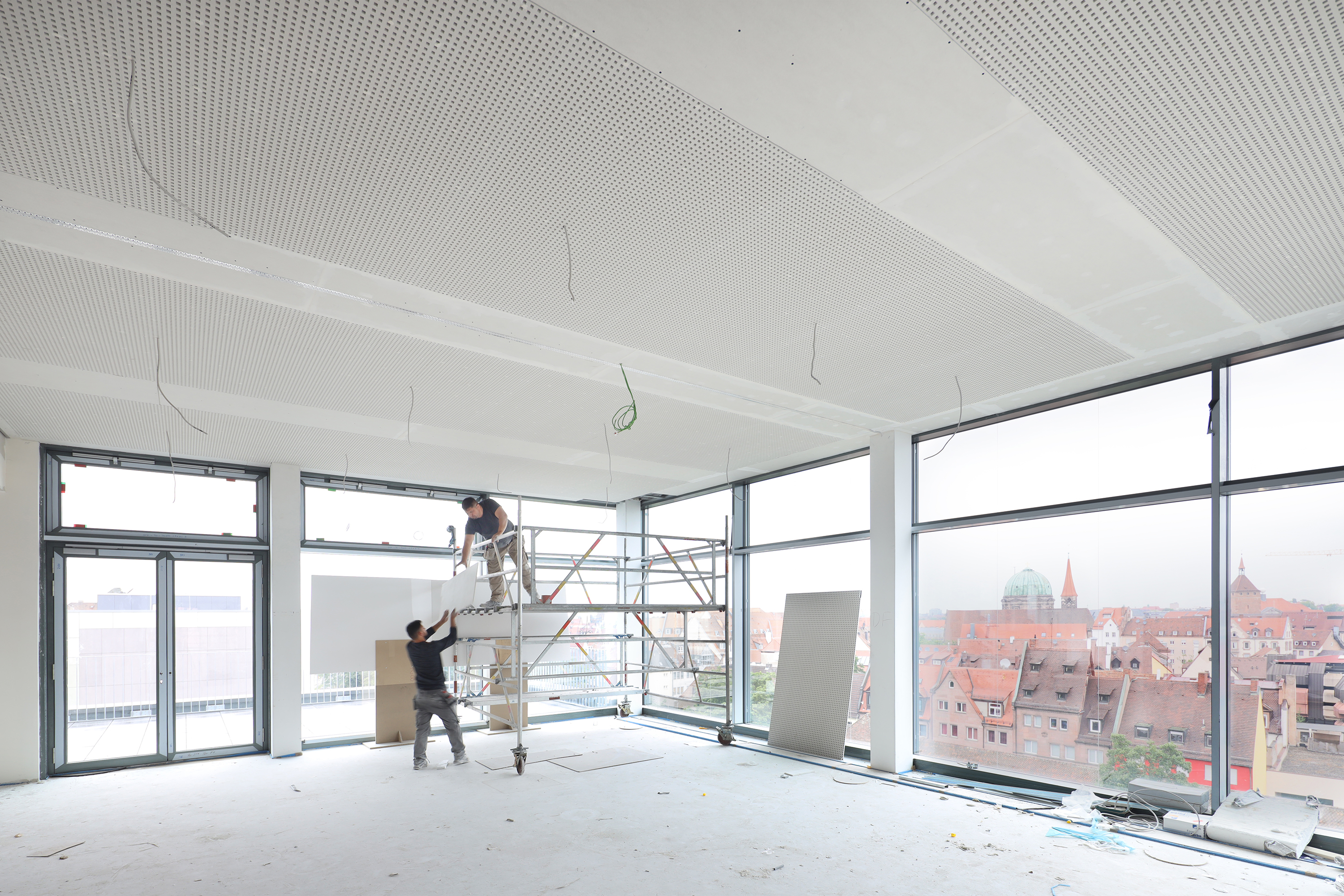 Wie vertragen sich eigentlich Wasser und Gipskarton? Perfekt! Vorausgesetzt, man verwendet zur Klimatisierung wasserdurchflossene Gipskarton-Konstruktionen. Die Montage von 8.500 m² Kühl-/Heizdecken war Highlight und Schwerpunkt des Ausbau-Pakets, welches Jaeger Ausbau Zwickau beim Neubau der AOK-Zentrale in Nürnberg abwickelte.