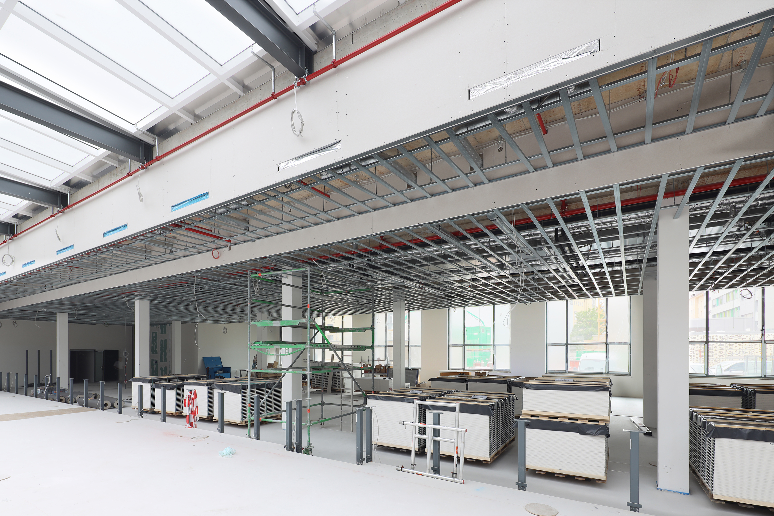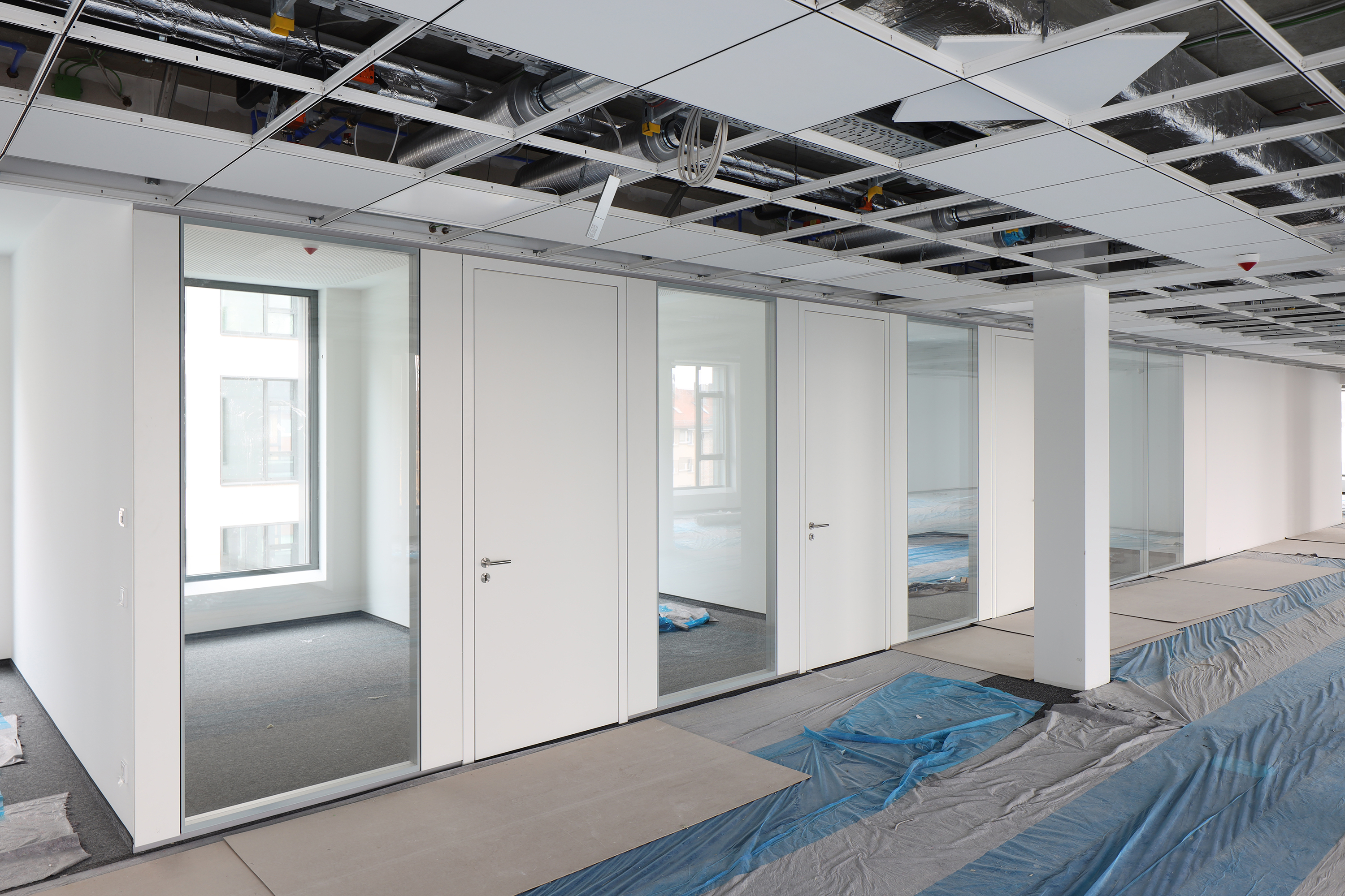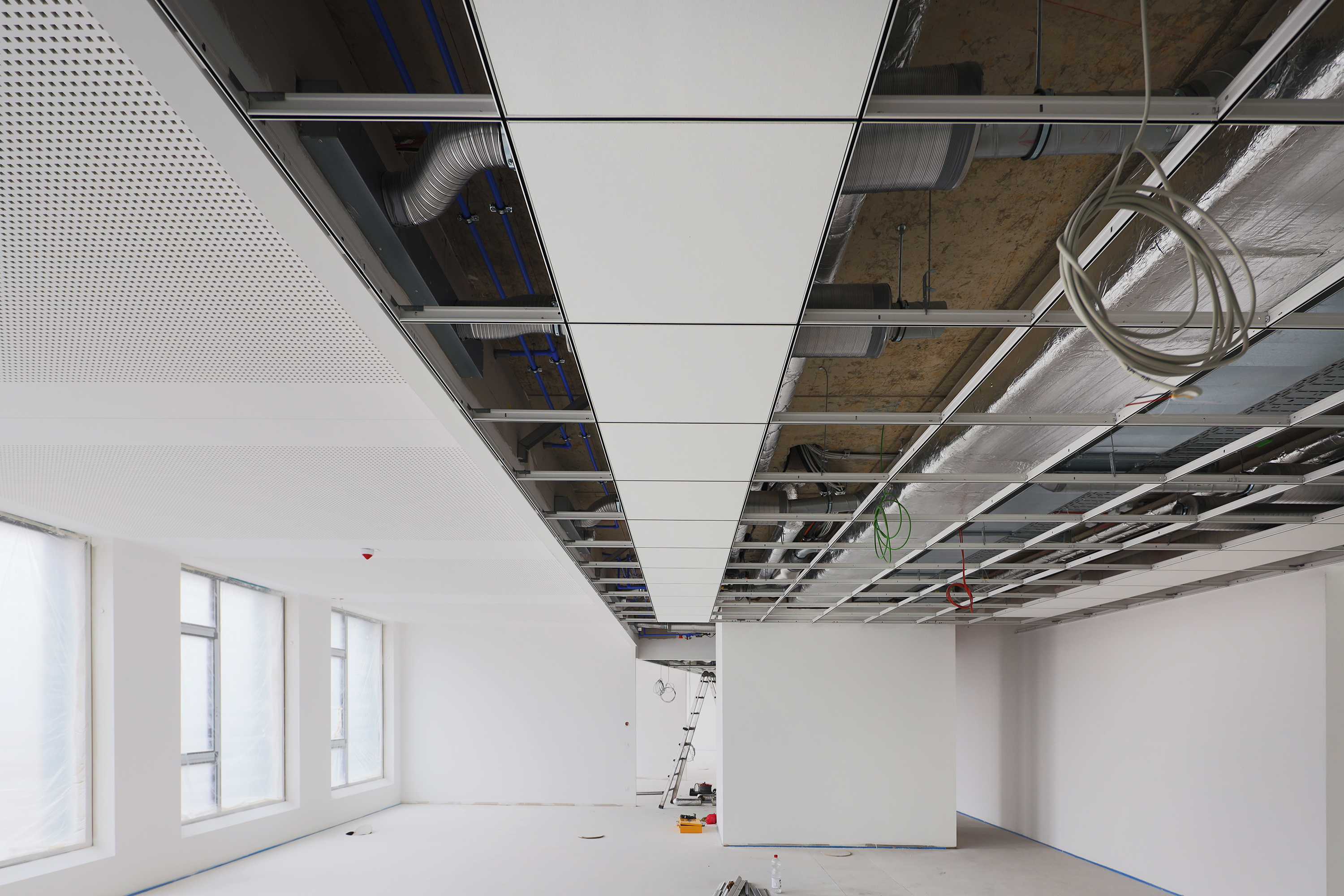 Für die Klimatisierung der Räume wurden spezielle Kühl-/Heizdecken der Firma Climadomo verbaut. Das Besondere: Die Gipskarton-Lochdecken sorgen zugleich für eine gute Raumakustik. „In die Gipsplatten sind Kapillarrohrmatten integriert, durch die je nach Jahreszeit kaltes oder warmes Wasser fließt. Die Montage unterscheidet sich nur unwesentlich von Standardlochplatten", erklärt Schlotter die Verarbeitung der Decken. Im gesamten Gebäude sind somit rund 10.000 Liter Wasser zum Heizen und Kühlen der Büroräume in der Gipskartondecke eingeschlossen. „Leider konnten wir wegen Corona keine Fotos im fertiggestellten Zustand machen. Das wären Top-Referenzbilder geworden. Dann eben beim nächsten Mal“, sagt ein zufriedener Ingo Schlotter zum Abschluss des erfolgreichen Projekts. Pandemiebedingt konnte auch die Eröffnung nicht groß gefeiert werden. Kunden und Mitarbeiter der AOK freuen sich dennoch über ihr neues Gebäude, das sich sehen lassen kann.