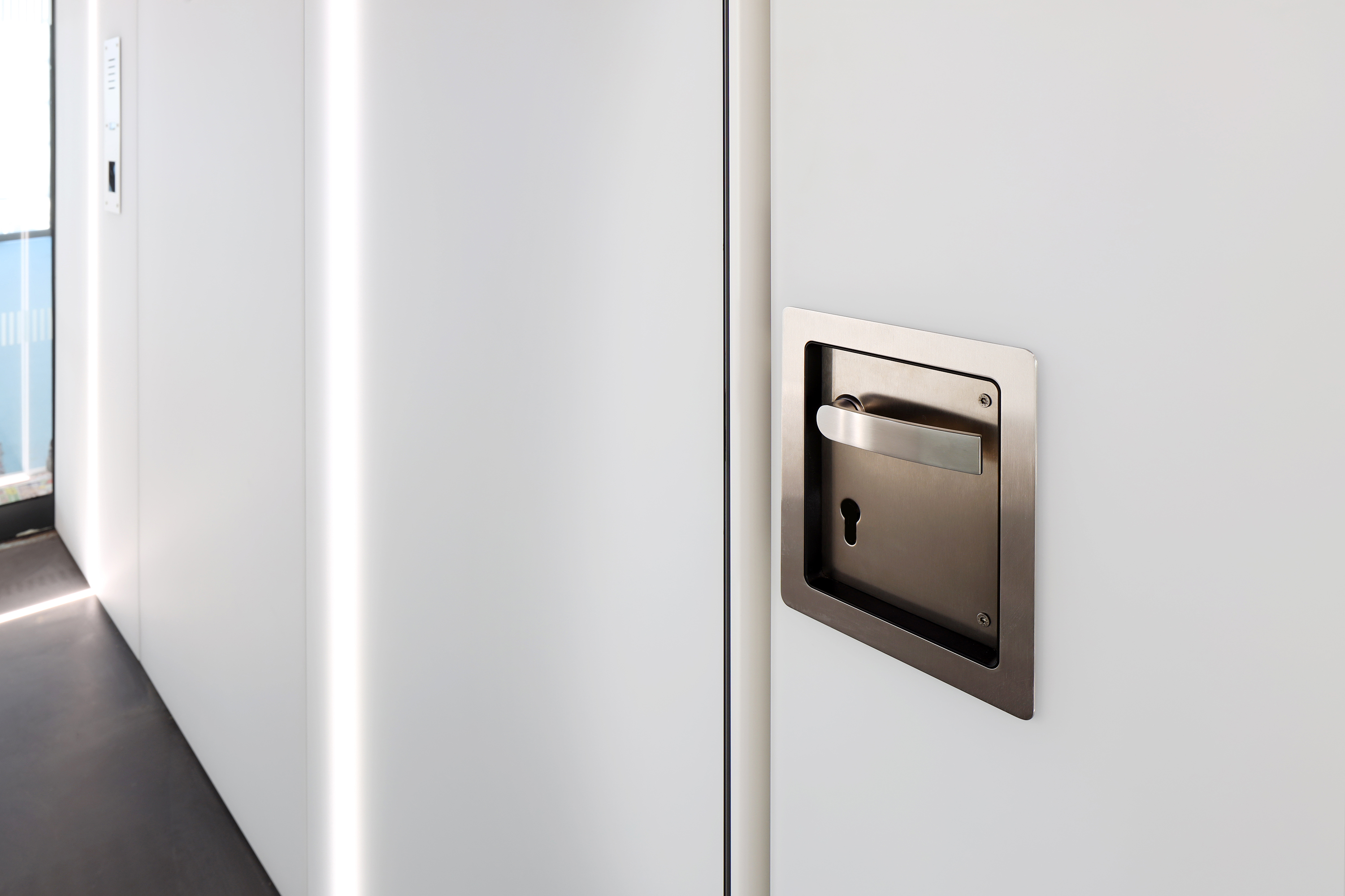 In die Glaswände wurden übergroße, zweiflüglige Brandschutztüren mit einem Maß von 3x3 Meter (fast) unsichtbar integriert, sogenannte IBO-Türen. Im Betrieb offen (IBO), müssen diese Türen im Brand- oder Rauchfall mit ihren 500 kg schweren Türflügeln automatisch schließen. Nicht weniger als eine messtechnische und bauliche Meisterleistung war dafür notwendig. Denn es musste unter anderem ein Überdruck berücksichtigt werden, der von der Lüftungsanlage erzeugt wird. Mit klassischem Trockenbau hat dies nur noch wenig gemeinsam. Fachwissen und hohe Ausführungsqualit.t verbinden sich mit neuen Technologien und einer Arbeit an der Schnittstelle zur Gebäudetechnik.