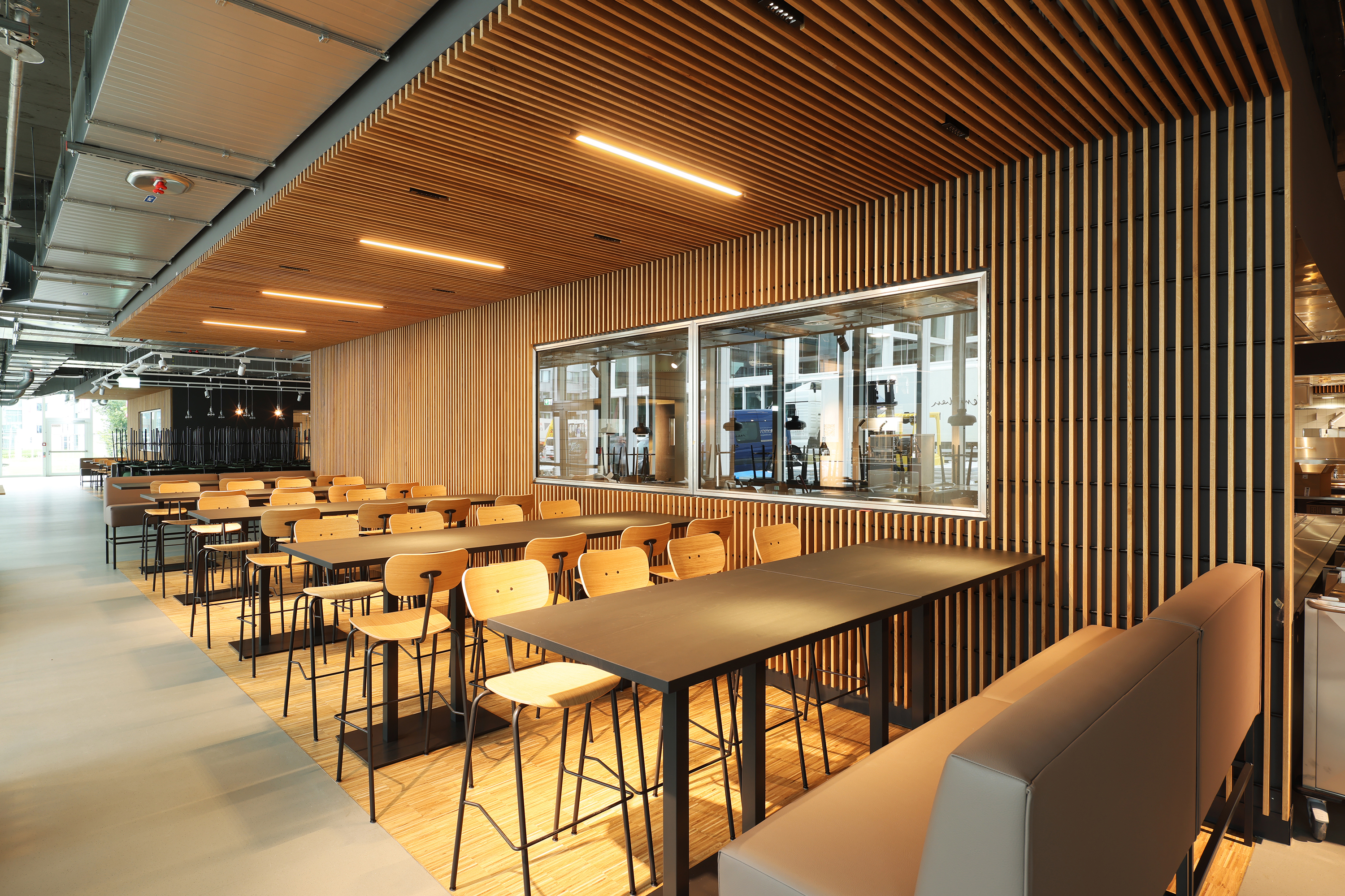 Auf dem Campus der Daimler Trucks AG in Leinfelden-Echterdingen sind auf rund 51.000 Quadratmetern flexible Projekträume und Kommunikationsflächen für engere Zusammenarbeit und noch mehr Effizienz entstanden. Dafür machten sich sechs Standorte der Jaeger-Ausbau-Gruppe daran, höchsten Ansprüchen in Qualität und Ästhetik gerecht zu werden. Als optisches Highlight bietet die Gastronomie mit hellen Holzlamellen viel Freiraum für frische Gedanken und gute Gespräche.