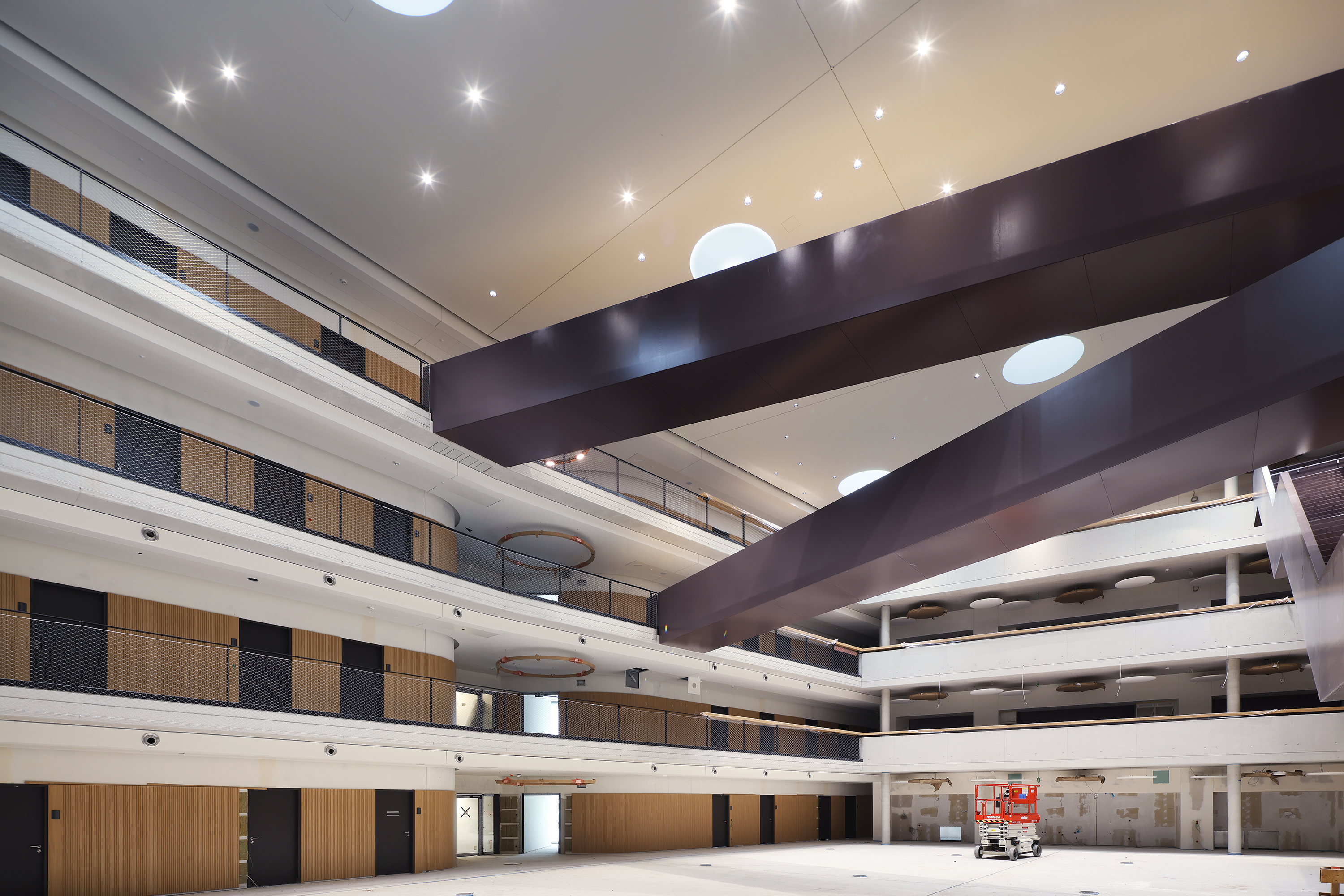 Das „Deutsche Zentrum für Luft- und Raumfahrt e. V.“ ist ein Bauherr, der großen Wert auf eine ressourcenschonende und besondere Bauweise legt. Damit ist er bei Jaeger Ausbau Köln/Bonn genau an der richtigen Adresse. Der Trockenbau-Experte führte nicht nur die klassischen Trockenbauarbeiten aus, sondern verantwortete auch allerhand Detail- und Sonderlösungen beim hochwertigen Innenausbau für den modernen DLR-Neubau in Köln. „Neben der Fleißarbeit waren vor allem kreative Ideen gefragt, so beispielsweise beim Atrium mit seiner 650 m2 großen Montagedecke, welche mittels circa 6.500 m2 Raumgerüst erstellt wurde“, erzählt Projektleiter Stefan Stellmach. Die zentrale Halle nimmt eine besondere Stellung im Gebäude ein, da alle Wege durch oder am Atrium entlangführen. Diese Bedeutung war dem Kölner Team durchaus bewusst. Mit großer Freude blickt man jetzt auf ein sowohl außergewöhnliches als auch gelungenes Projekt.