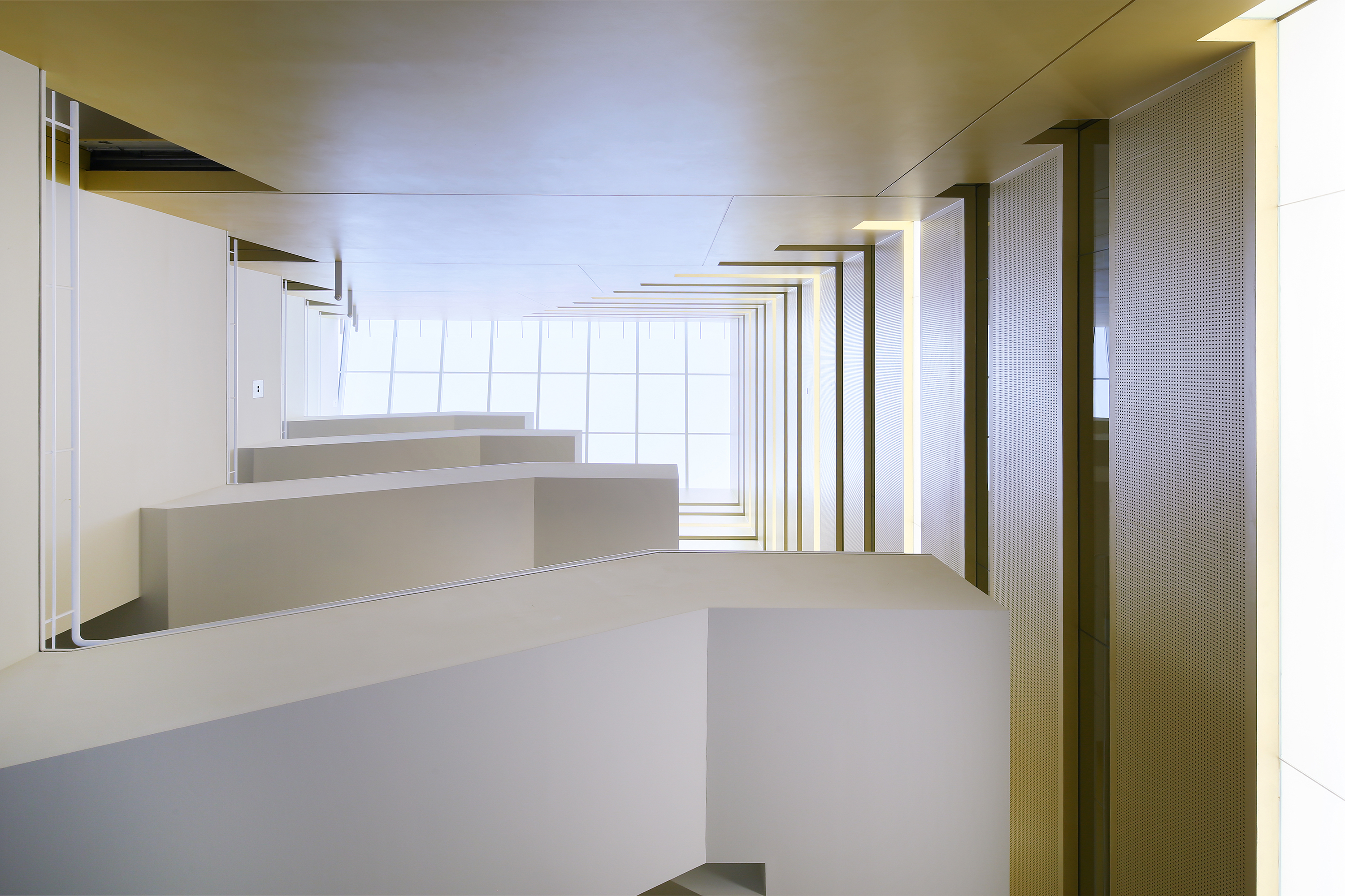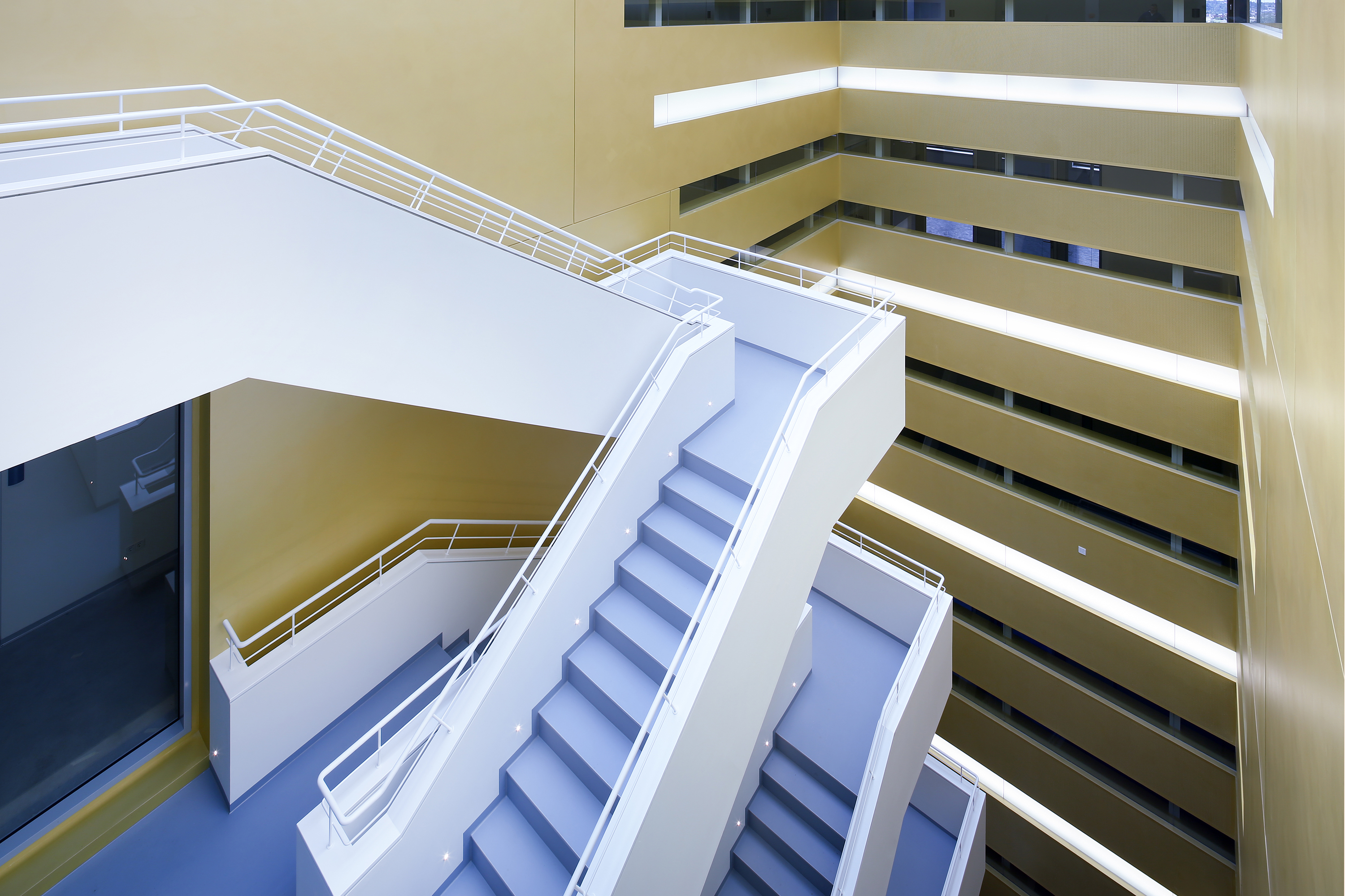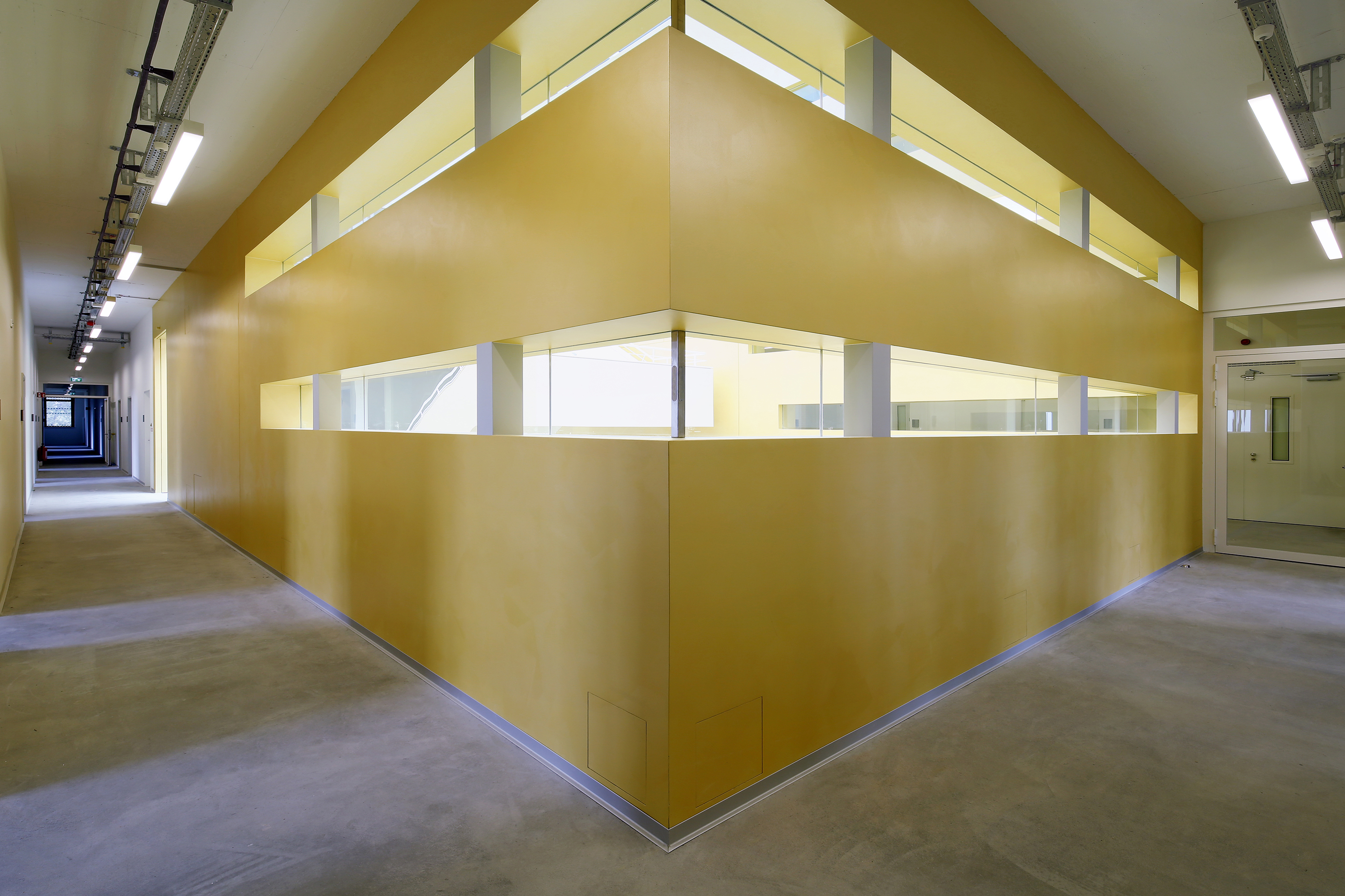 Die nackten Zahlen sind gut, aber machen allein noch kein spektakuläres Projekt: Innerhalb von 15 Monaten wurden durch Jaeger Ausbau Rhein-Main rund 8.500 m2 GK-Wände und GK-Vorsatzschalen, 2.700 m2 GK-Decken (zum großen Teil schallabsorbierend) sowie 200 Türen mit und ohne Brandschutzanforderungen montiert. Wirklich spektakulär sind jedoch die Innenansichten des fertigen Gebäudes, die damit geschaffen wurden. Vor allem das Atrium ist ein besonderer Blickfang. In diesem staffelt sich eine Treppe nach oben und in jedem Geschoss befinden sich an den Galeriekanten Besprechungs- und Kontakträume. Damit ist ein Raum mit großen Aufenthaltsqualitäten und einer eigenen Identität entstanden.