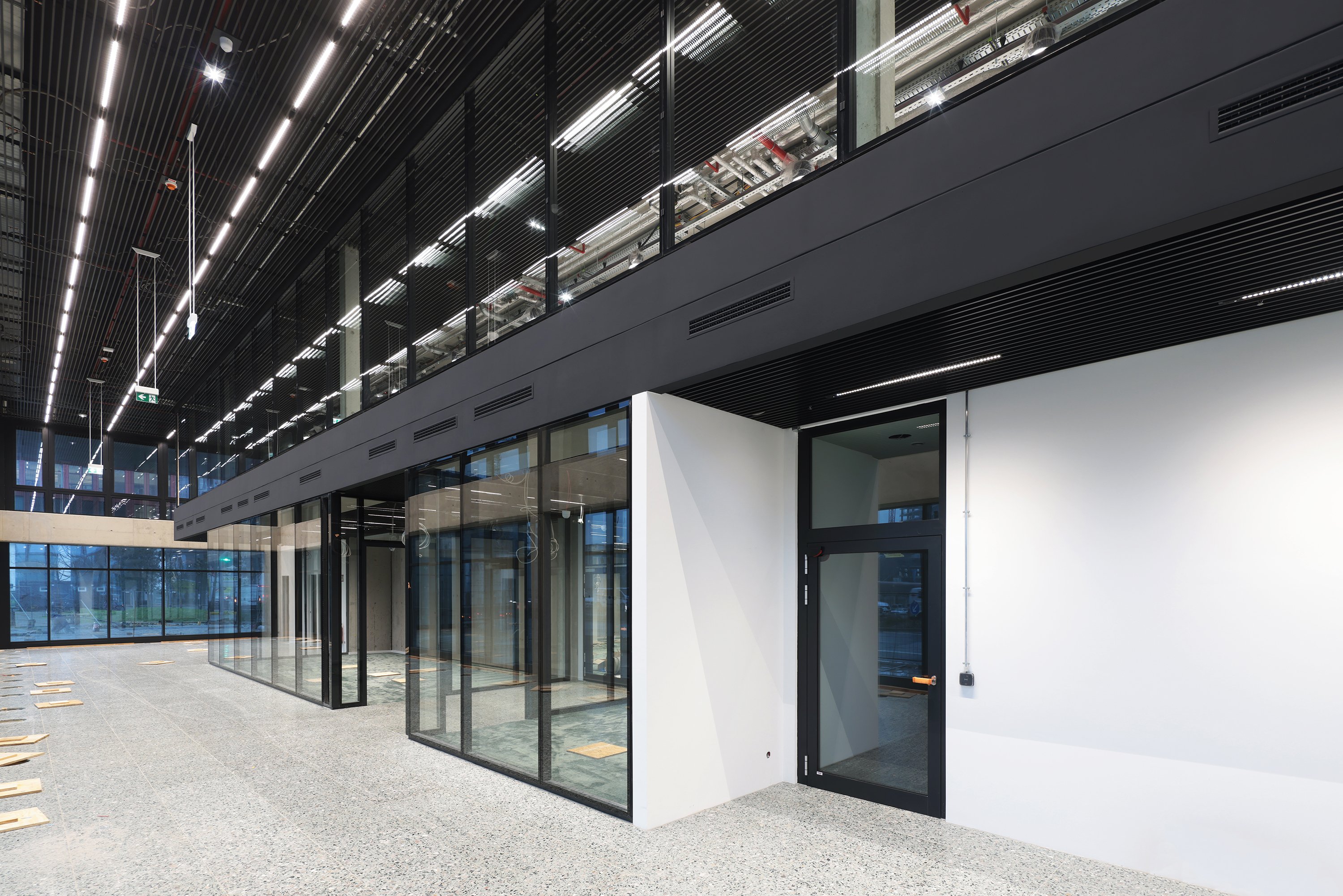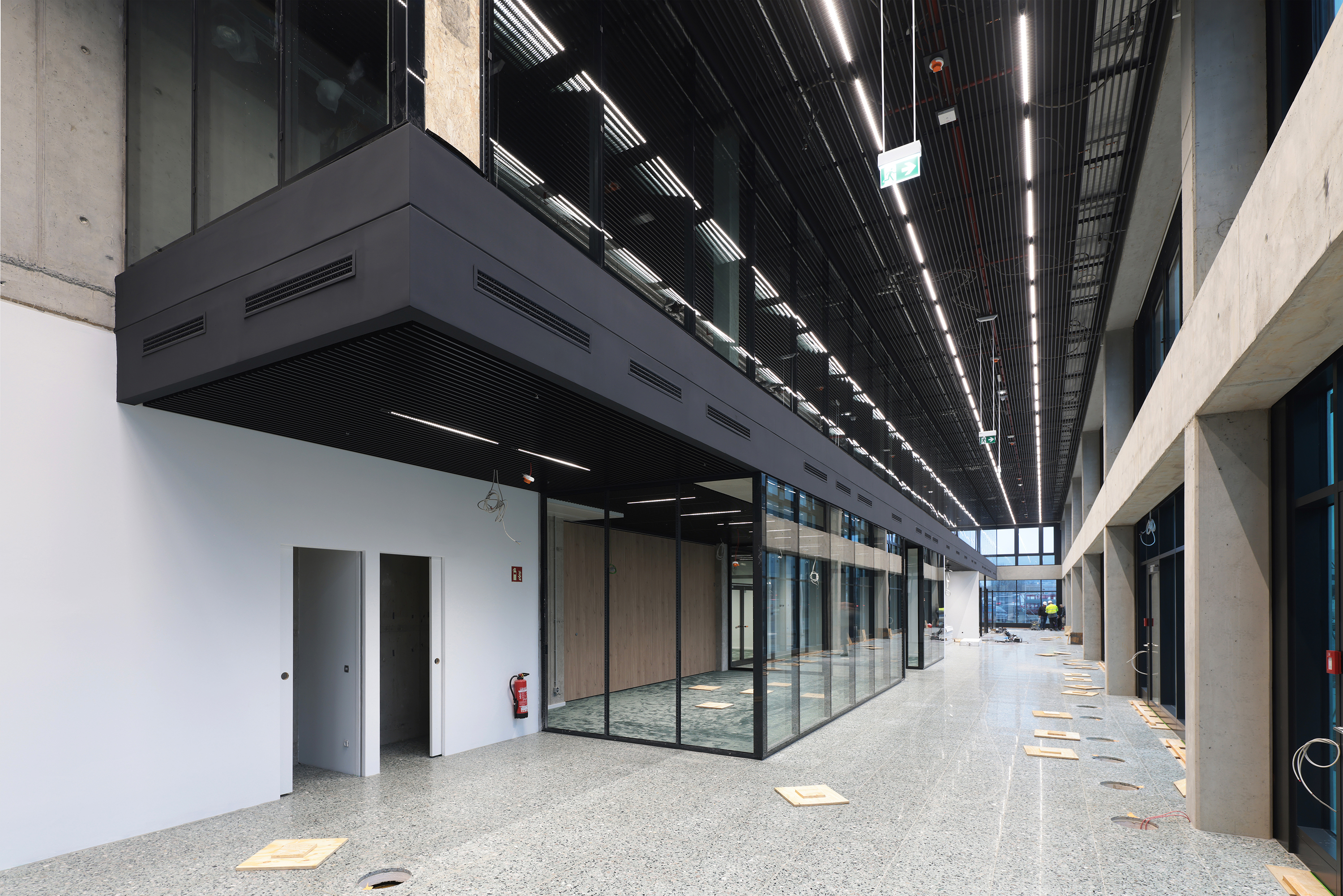 Jaeger Ausbau war für Trockenbauarbeiten, Teile der Malerarbeiten, Akustikverkleidungen sowie die Lufttechnik zuständig. Eine besondere Herausforderung war die Verkleidung der Tragkonstruktion des Atriumdaches. Teile der Verkleidung konnten aufgrund baulicher Abläufe erst gegen Ende des Projekts fertiggestellt werden, nachdem keine Gerüste mehr zur Verfügung standen.