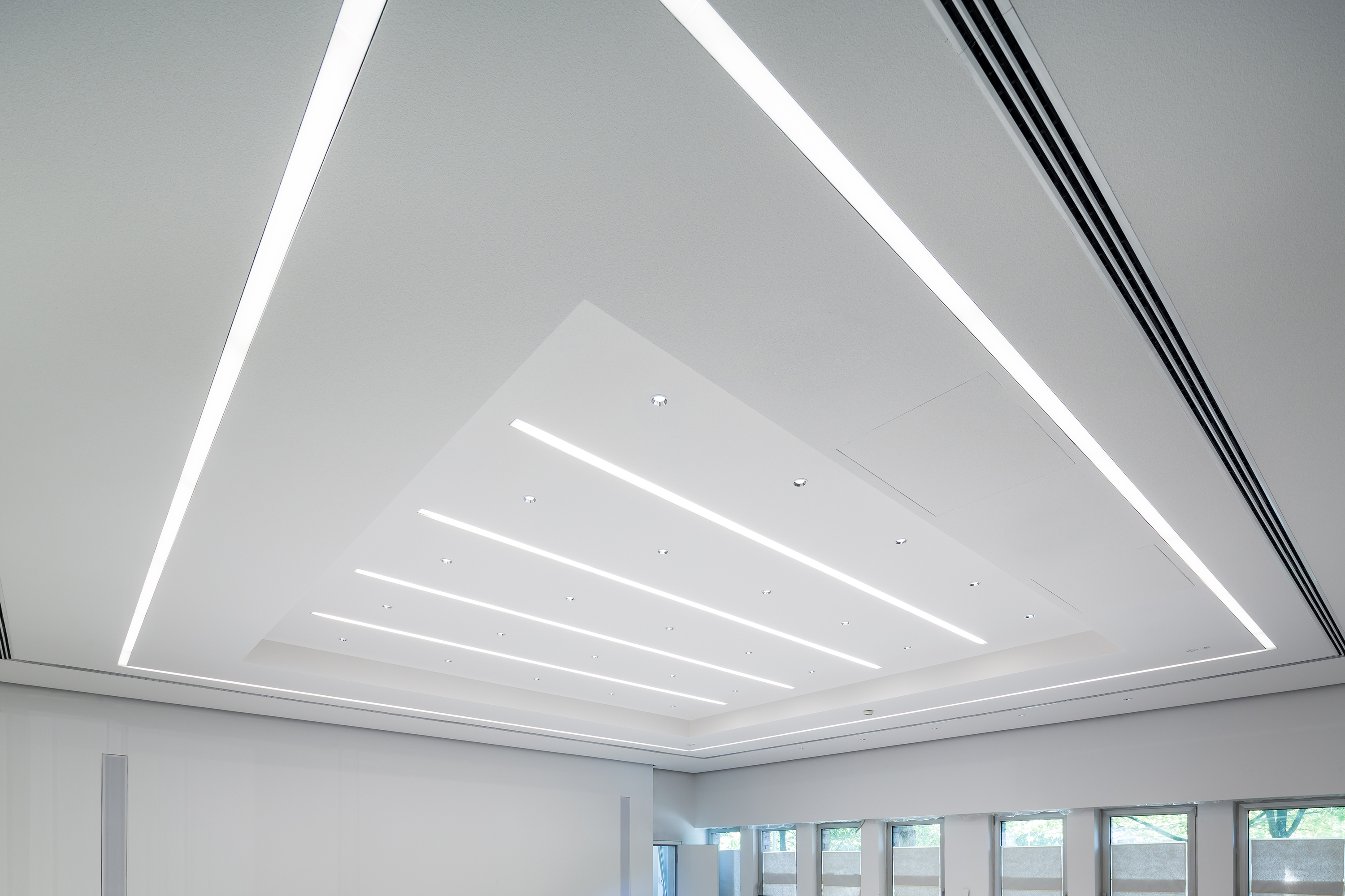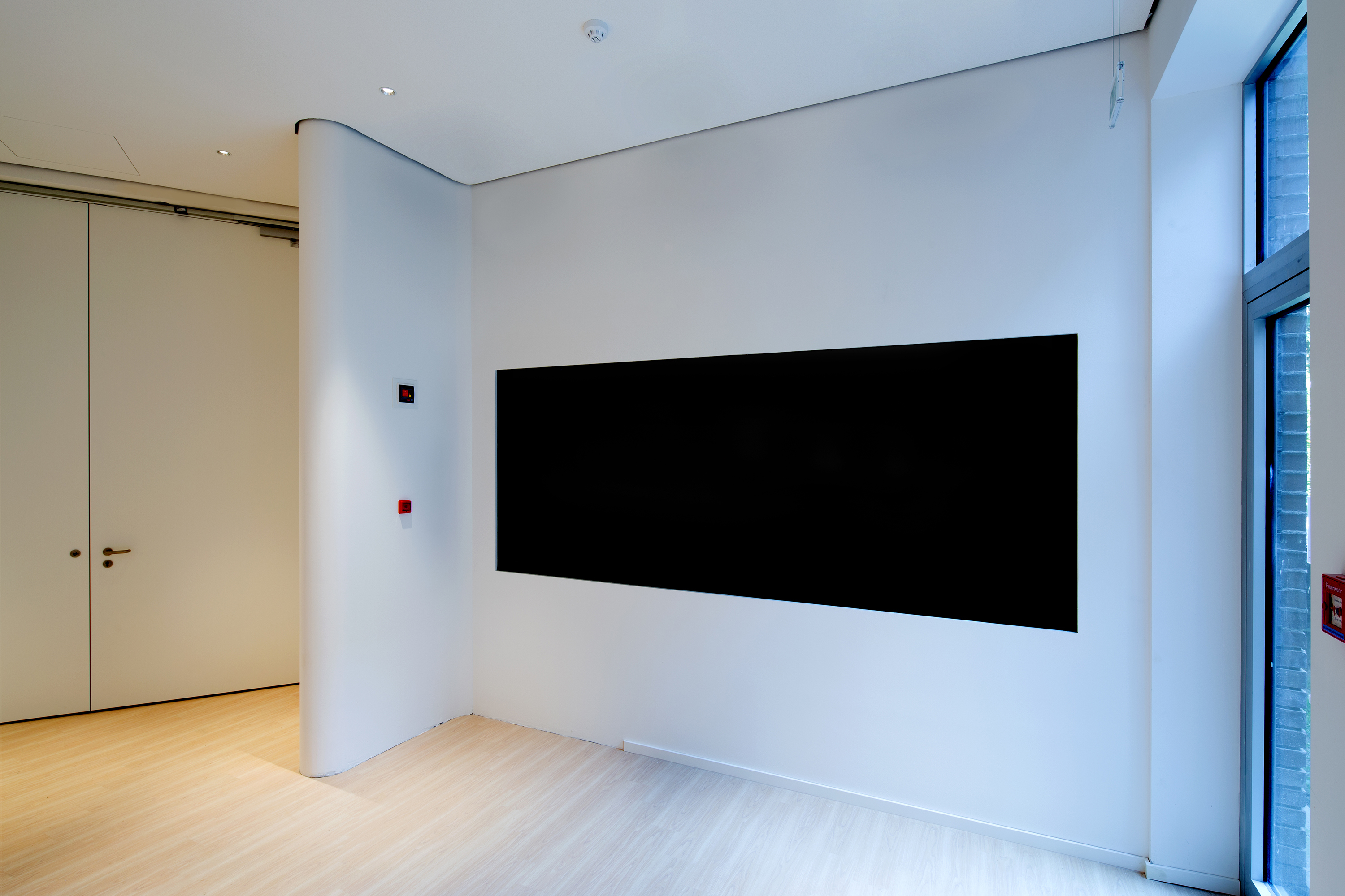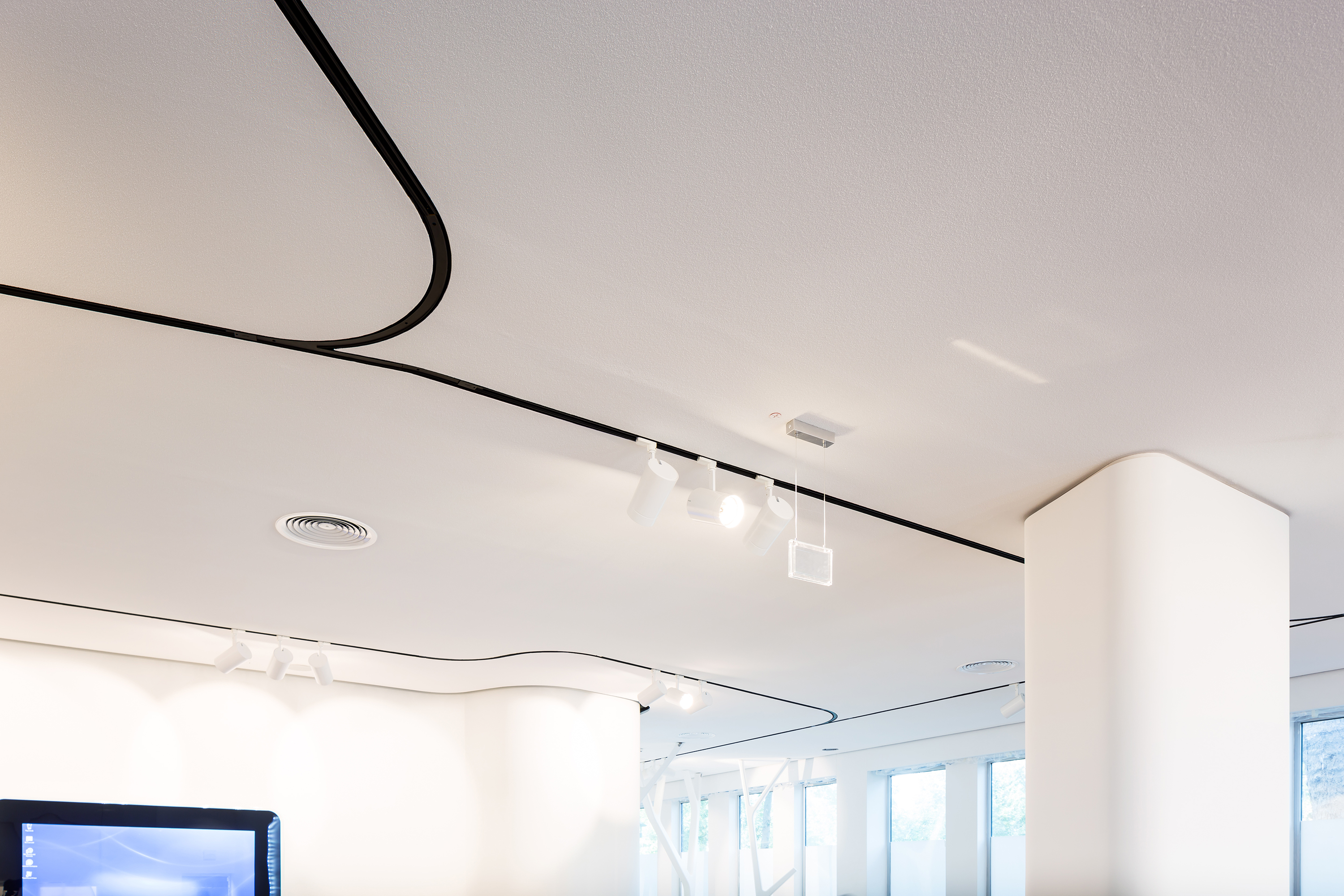 Erster Höhepunkte der Arbeiten: eine Heiz-Kühl-Decke mit punktuell aktiven Feldern. Dabei hat unser Team aus Krefeld nicht nur montiert, sondern sowohl die Werksplanung erstellt, die Kühlleistung berechnet und eingestellt als auch abschließend mittels Thermografie nachgewiesen. Zweiter Höhepunkt war die organische Deckenform mit niveaugleichen Stromschienen in diversen Radien, die sich an die bauseitigen Wände anlehnten. Als dritte Besonderheit wurden schließlich Innentüren mit Flügelhöhen bis 3,42 m, teils mit T-30/RS-Anspruch geliefert und montiert. Im Ergebnis entstand ein Showroom, der die Kunden begeistert.