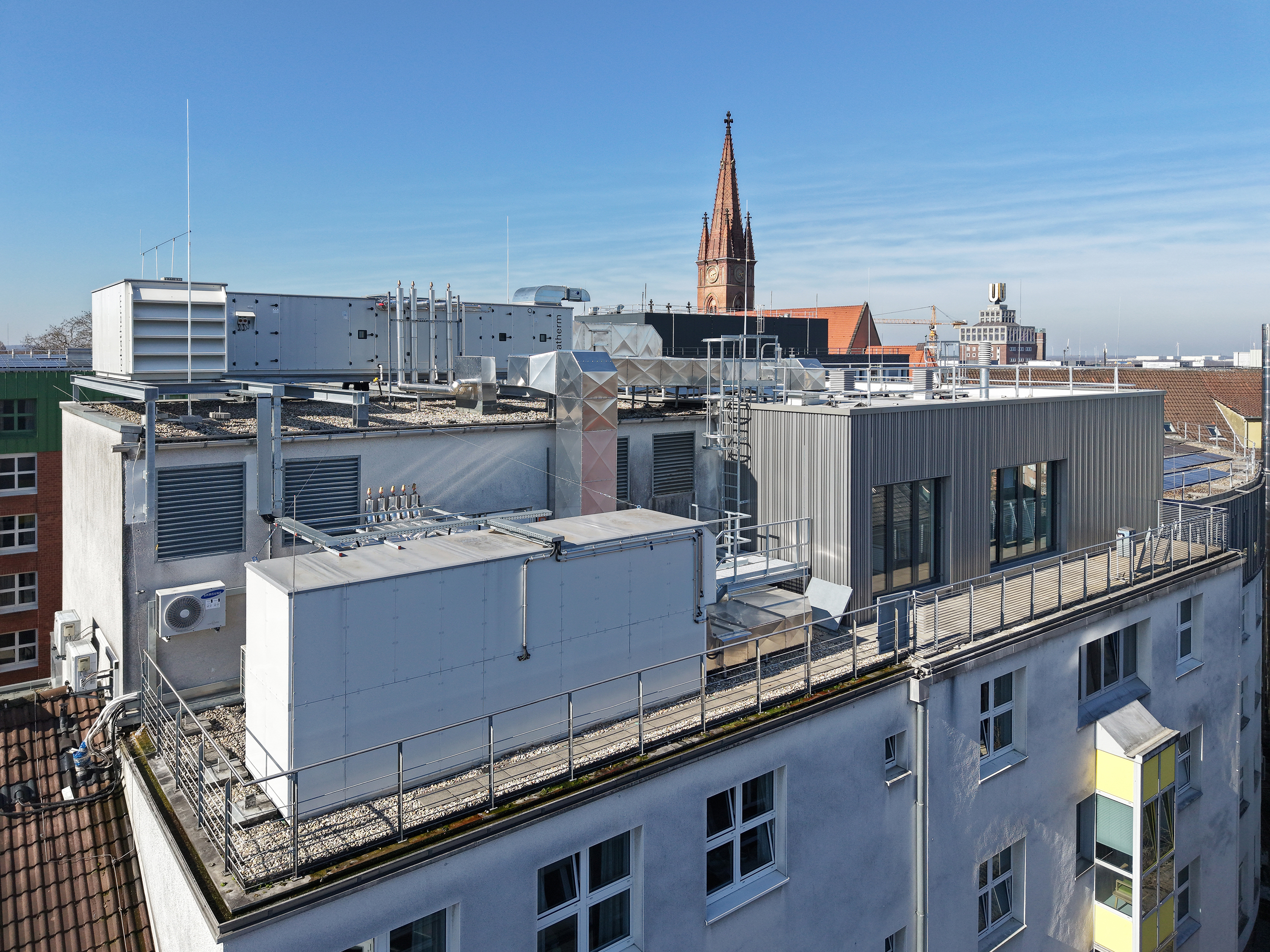 Im fünften Obergeschoss des Johannes Hospitals Dortmund entstand in Modulbauweise eine völlig neue Station für immunsupprimierte und hochansteckende Patienten. Zunächst mussten innerhalb von 14 Tagen die alte Station abgebrochen und die neuen, vorgefertigten Gebäudemodule installiert werden.