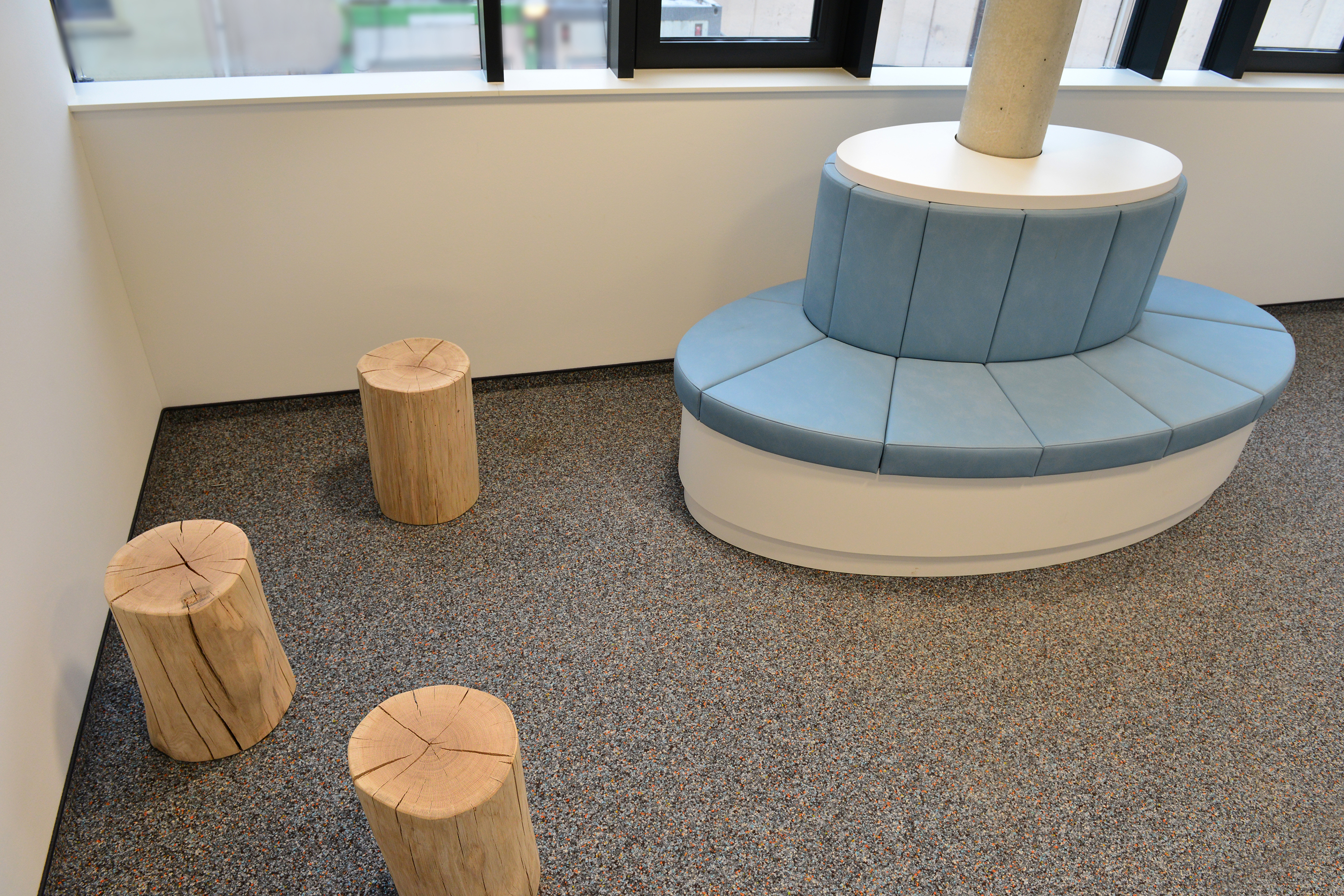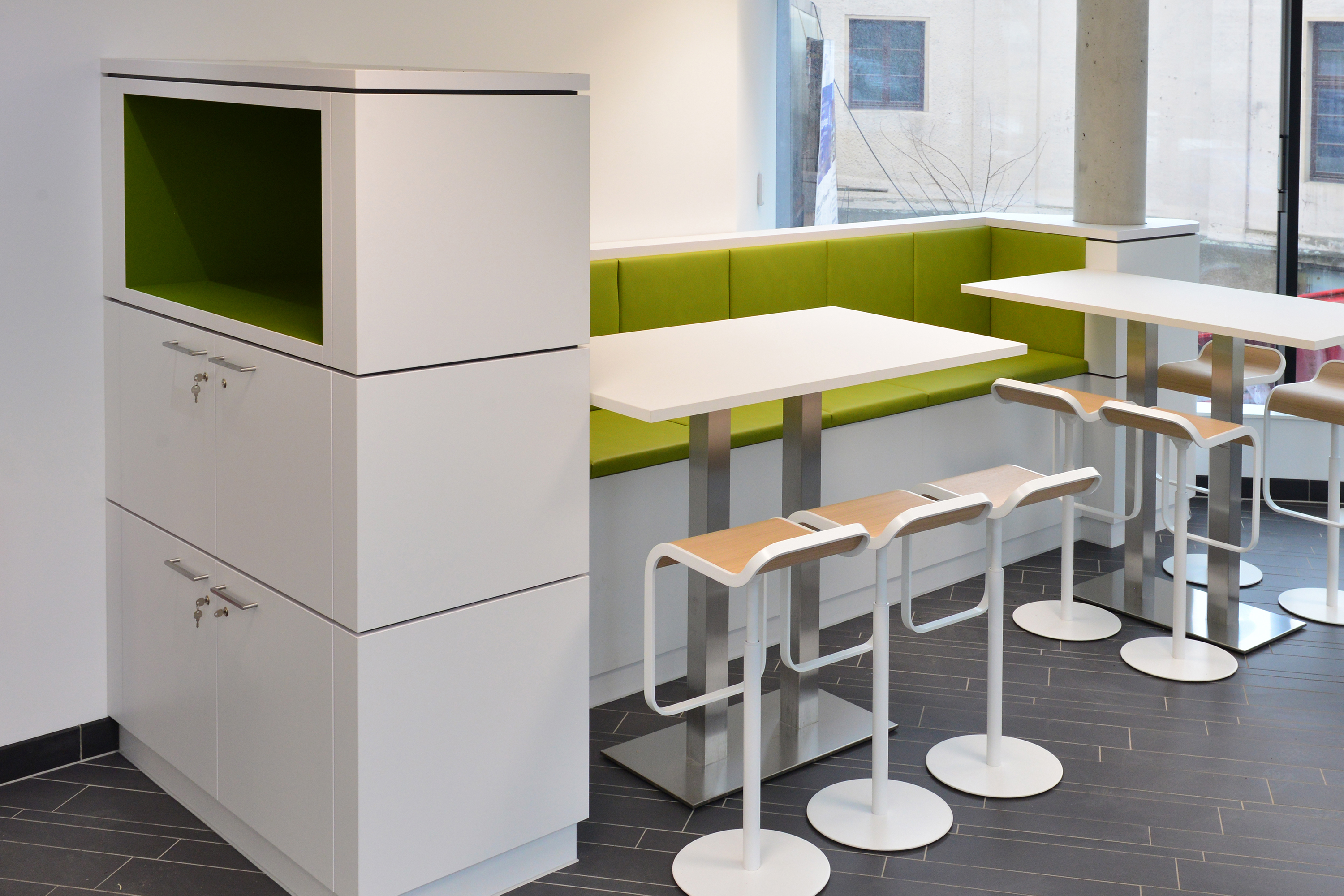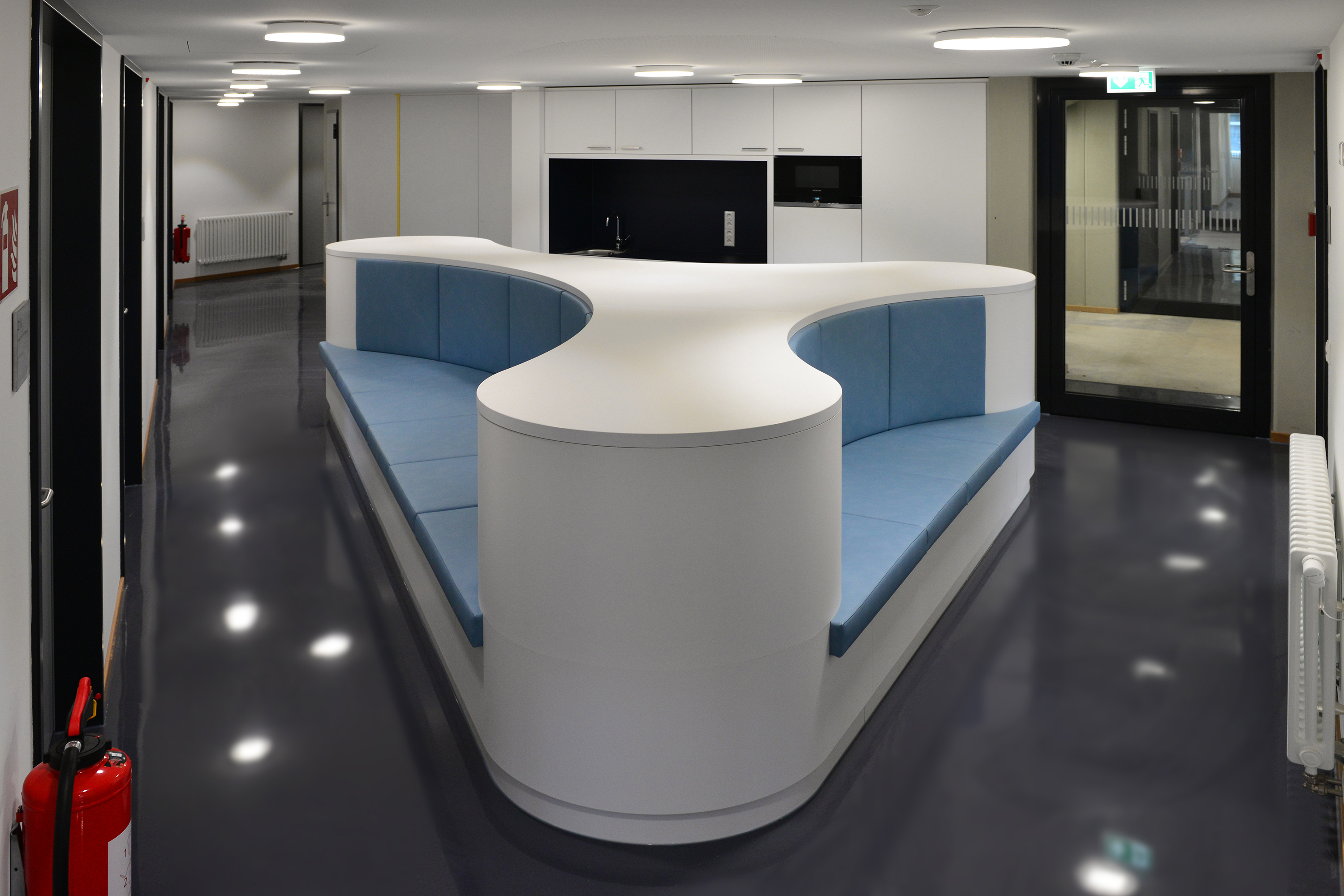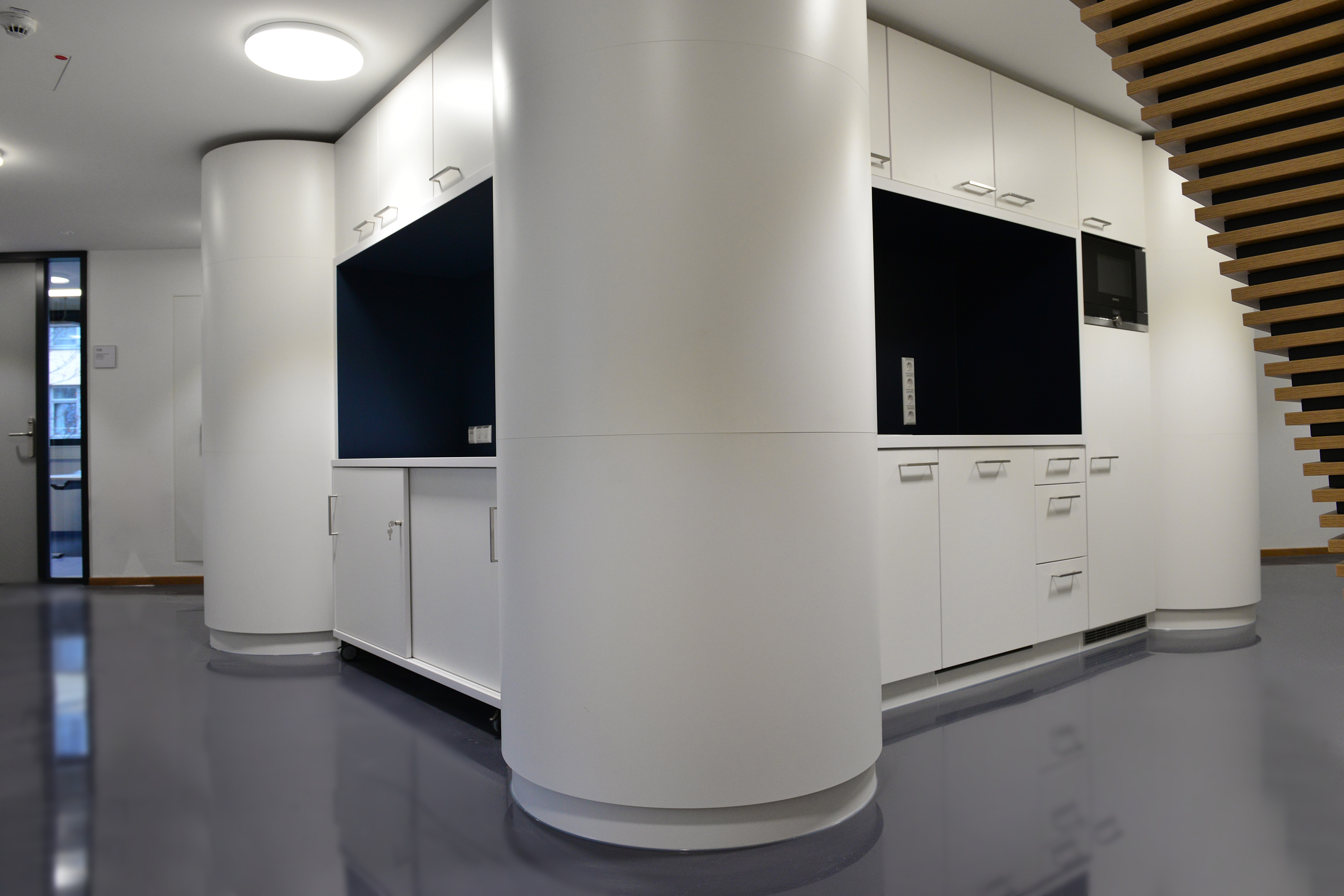 Bernd Hille betreute als Projektleiter den universitären Neubau und war vor allem von der Dimension begeistert: „Für uns war es ein ganz besonderer Auftrag, und das mit vielen schönen Herausforderungen“, erzählt er. Aufgrund der zahlreichen Formelemente, die vom Architekten in den Neubau integriert wurden, mussten im Vorfeld aufwendige Arbeitsvorbereitungen getroffen werden, ehe mit der individuellen Herstellung von Sondermöbeln, Tresen, Sitzbänken und Einbauküchen begonnen werden konnte. Die Jaeger-Tischler haben hierfür eine moderne Materialkombination aus High-Pressure-Laminaten in Kombination mit Leder und Linoleum verwendet und teilweise auch umfangreiche Polsterarbeiten vorgenommen. „Die modernen Möbel von Jaeger Ausbau passen wirklich perfekt in den hochwertigen Forschungskomplex, der außen wie innen einfach nur beeindruckt“, lobt Projektleiter Hille.