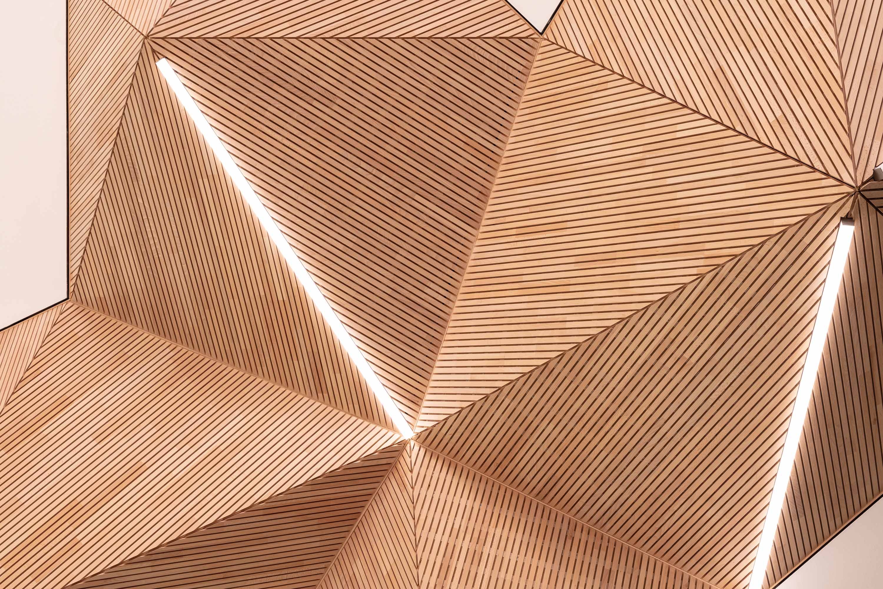 Am Ort des Geschehens setzten die Mitarbeiter von Jaeger Ausbau dann final sämtliche Dreiecksflächen zusammen. Die schiefwinklige Pyramidenkonstruktion wurde anschließend mittels dünner Holzlatten als Grund- und Tragprofil in die Unterkonstruktion aus Gipskartondecken und gebogenen Gipskartonvorsatzschalen integriert. Neben den Schattenfugen an den Übergängen der Holzverkleidung musste zudem ein besonderes Augenmerk auf die gesamte LED-Beleuchtung, Elektro-Installationen und Medientechnik gelegt werden. Dementsprechend eng war die Zusammenarbeit mit der verantwortlichen Elektrofirma. „Die Montage hatte es wirklich in sich und hielt uns wegen des knappen Bauzeitfensters von nur drei Monaten ganz schön in Atem, am Ende ist aber etwas Außergewöhnliches entstanden“, fasst der Projektleiter den Bau der Pyramiden von Würzburg zusammen.