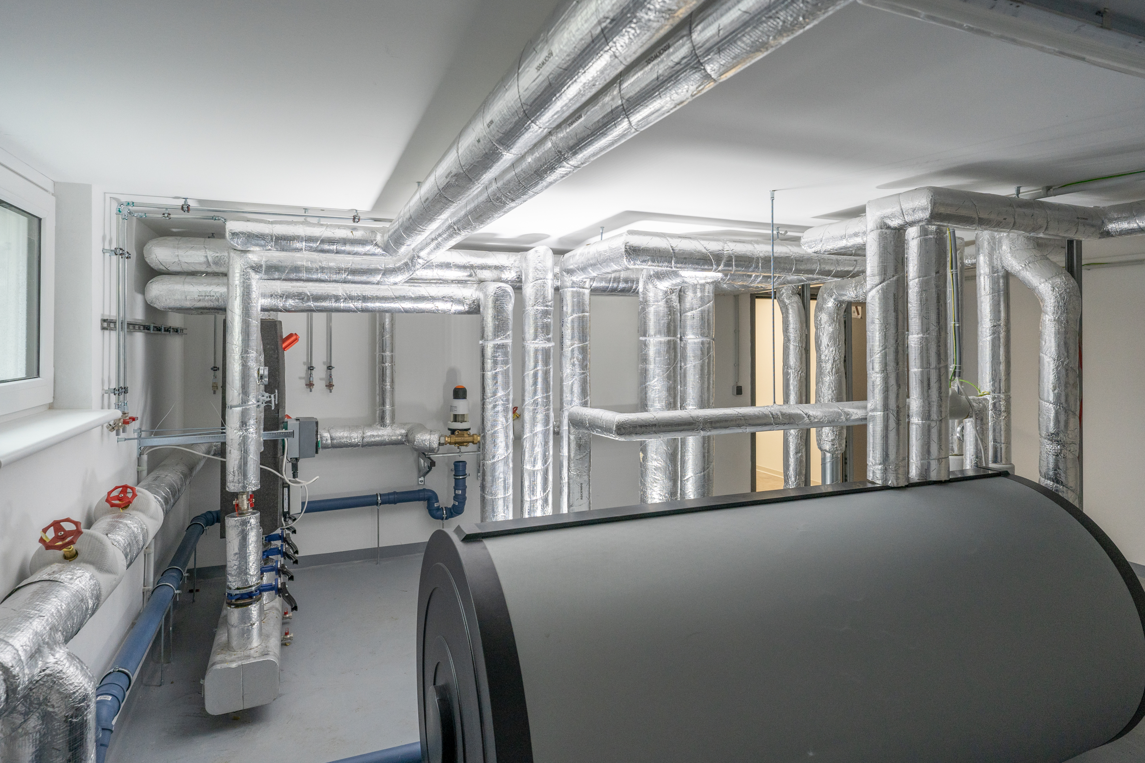 Die größte Herausforderung bei dem Projekt bestand aber darin, dass der Einbau der Anlagen für Heizung, Sanitär und Lüftung ohne anliegende Medien zu erfolgen hatte. Sprich: Es lagen weder Wasser noch Abwasser sowie Fernwärme und Strom an. Aufgrund dieser fehlenden Gegebenheiten musste das Team von Jaeger Haustechnik Provisorien errichten, um die Anlagen testen zu können. „Nur so konnten wir beispielsweise Druckprüfungen vornehmen und damit die Zuverlässigkeit der Inbetriebnahme belegen“, erklärt Henri Geier das eher ungewöhnliche Vorgehen. Der Aufwand hat sich gelohnt: Nach einer Bauzeit von etwas mehr als einem Jahr wurde die Hälfte des „Waldquartiers Bernau“ fertiggestellt. Und bald geht es mit dem zweiten Bauabschnitt im Süden weiter. Jaeger Haustechnik wird als leistungsstarker Dienstleister im Bereich Heizung, Sanitär und Lüftung wieder einen wichtigen Part übernehmen.