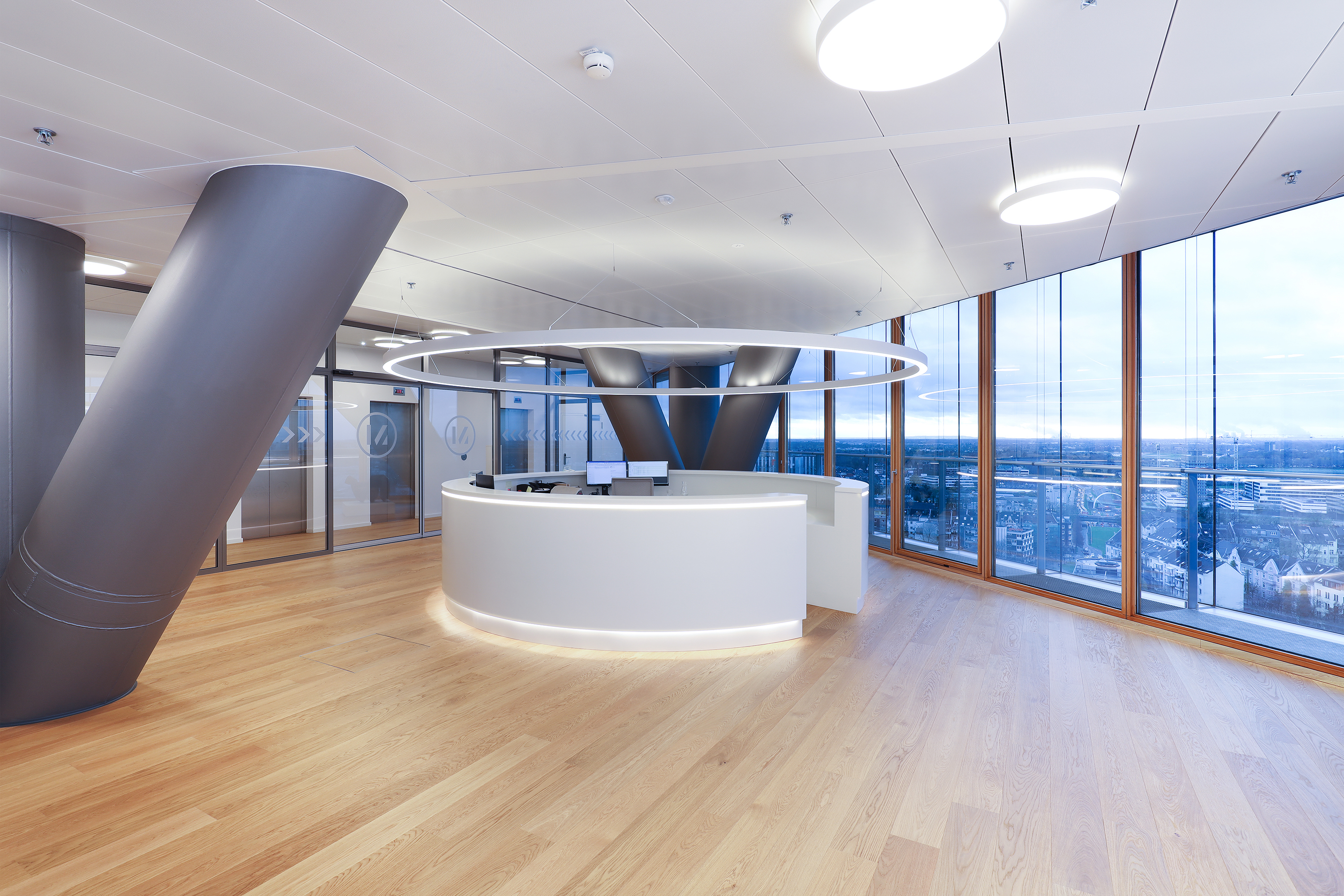 Für den Ausbau im 18. bis zum 20. Stockwerk wurden unter anderem neue Böden verlegt, Türen eingebaut, Glaswände für Meetingräume und den Bürobereich installiert und der komplette Sanitärbereich auf hohem Niveau mit maßgefertigten Möbeln erneuert. Im Konferenzbereich sind die Wände in den Bürofluren über Lightpanels (Lichttafeln) komplett beleuchtet. Zudem hat man spezielle Schachttüren, Brandschutztüren und eine Stahlglaswand als Pfosten-Riegel-Konstruktion mit Glas-Schiebetür im 18. Stockwerk eingebaut. „Wir sind sehr zufrieden, dieses aufwendige Projekt in diesem repräsentativen Gebäude im laufenden Betrieb und in Rekordzeit umgesetzt zu haben“, so Projektleiter Berger.