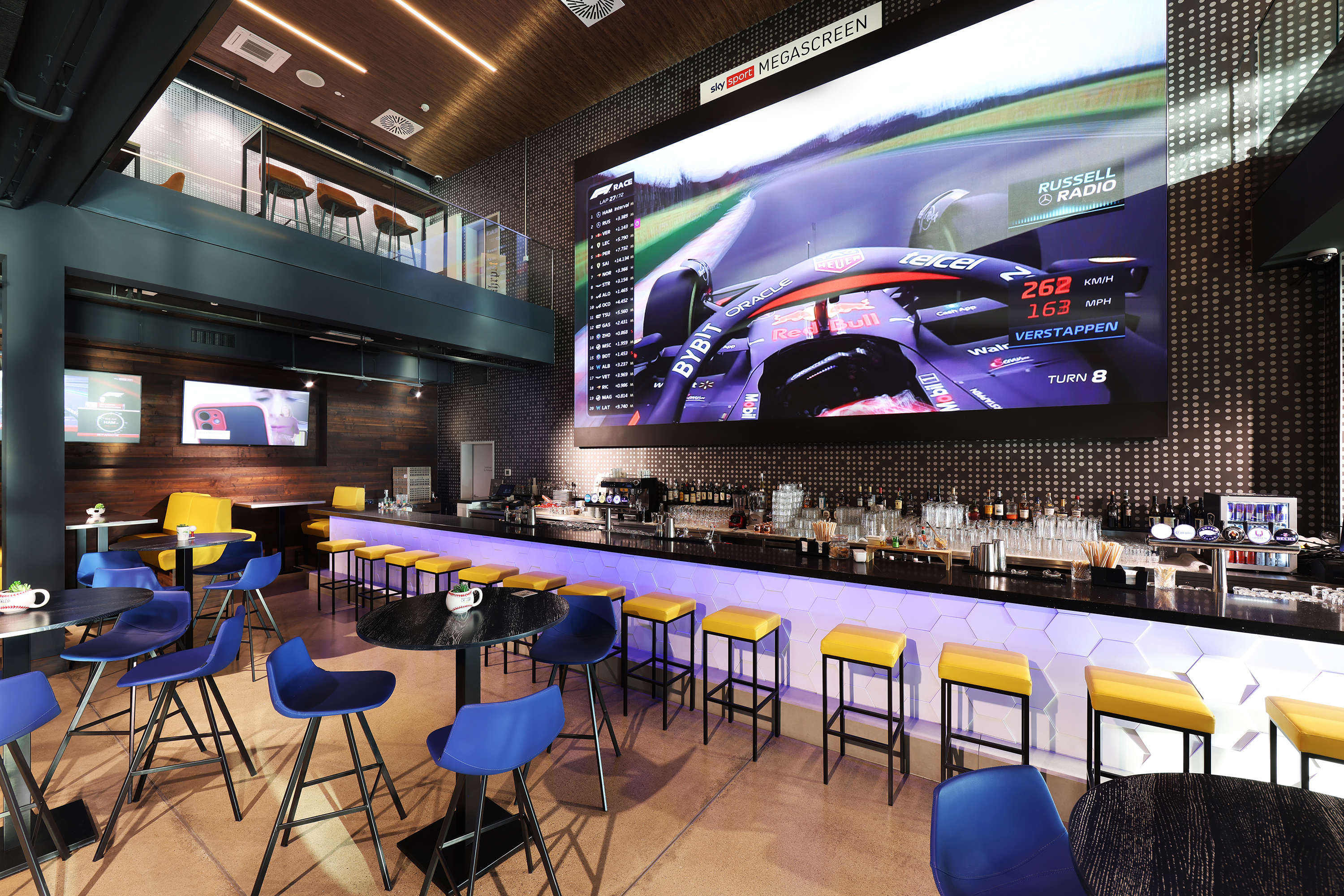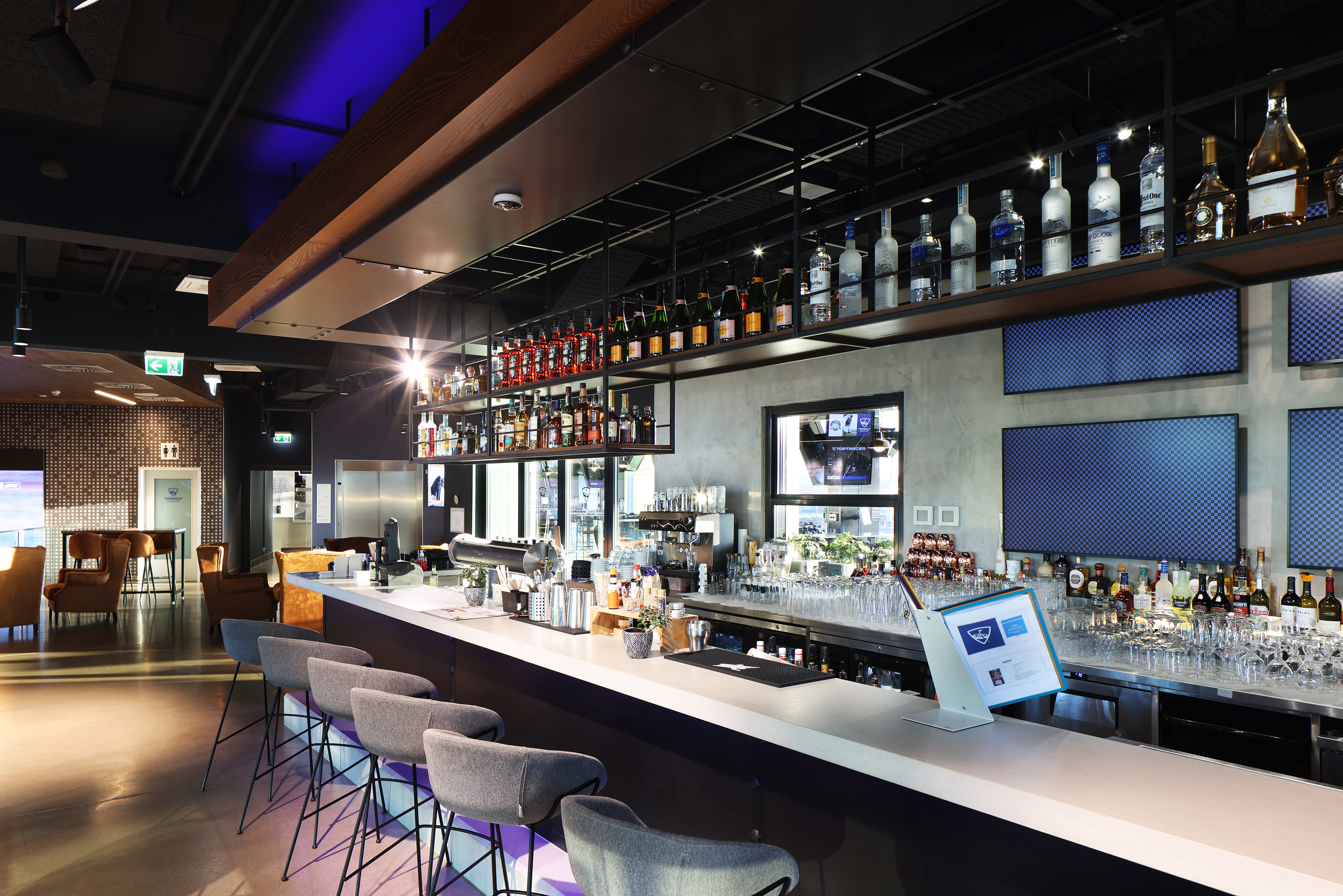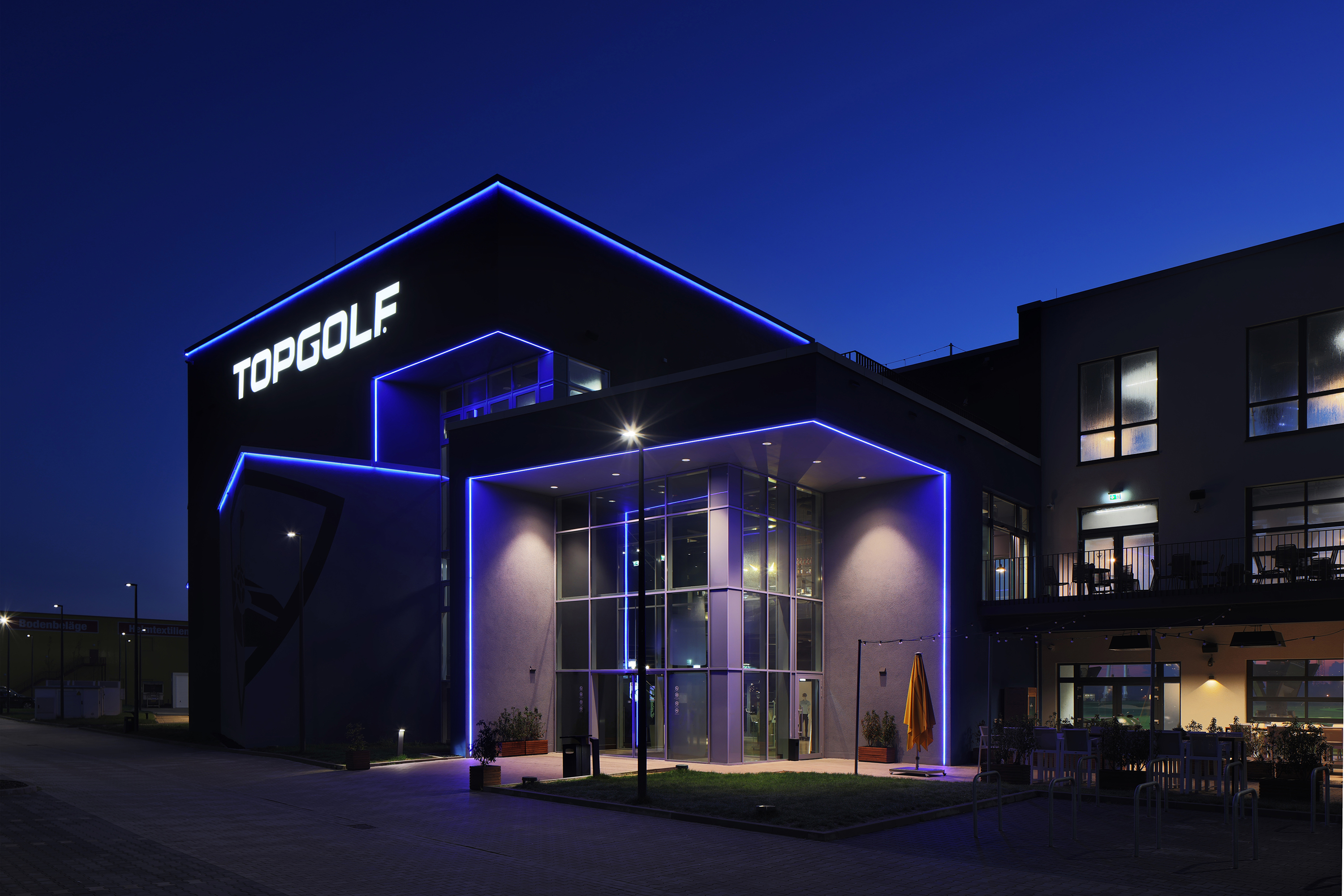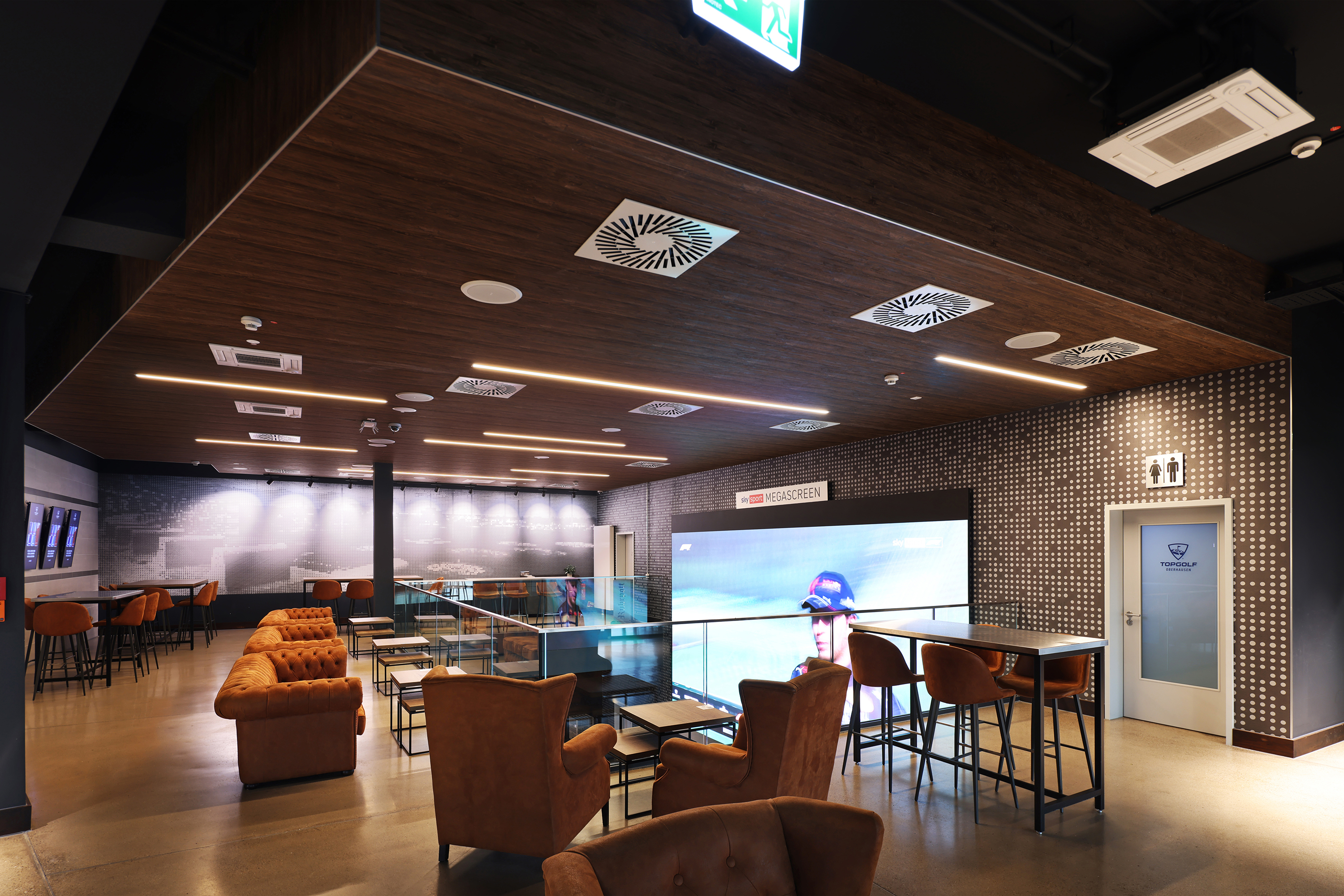 Da aus Brandschutzgründen keine Holzdecken integriert werden konnten, verwendeten sie in einigen Teilen Tapeten in Holzoptik. Im Eingangsbereich brachten die Maler mit einem Hubsteiger eine aus den USA importierte, elf Meter hohe Spezialtapete an. In den Abschlagbuchten strichen sie über 700 Meter Markierungen, und hinter dem Empfang klebt jetzt ein Teppich in Rasenoptik mit dem Topgolf-Logo an der Wand.