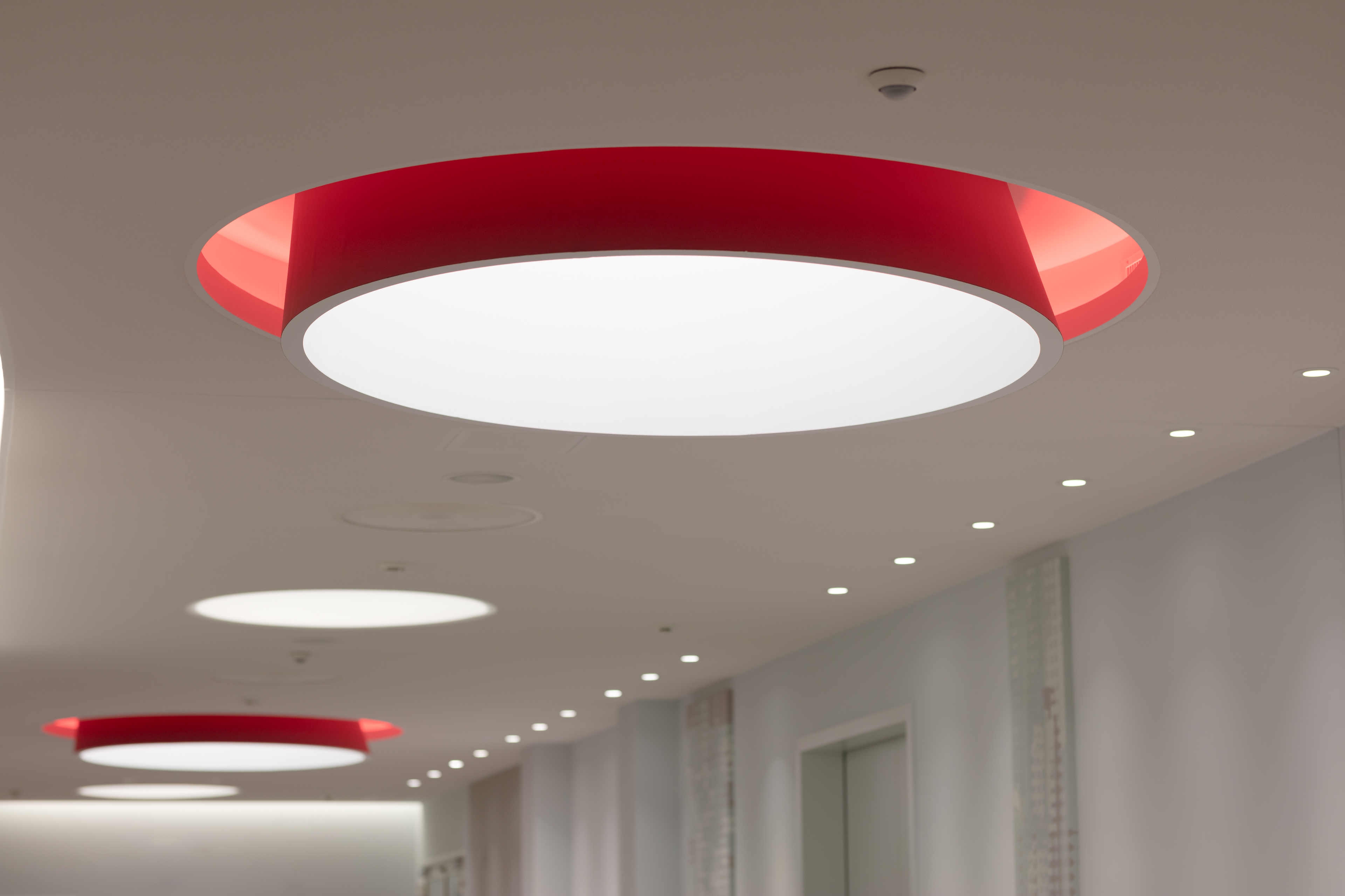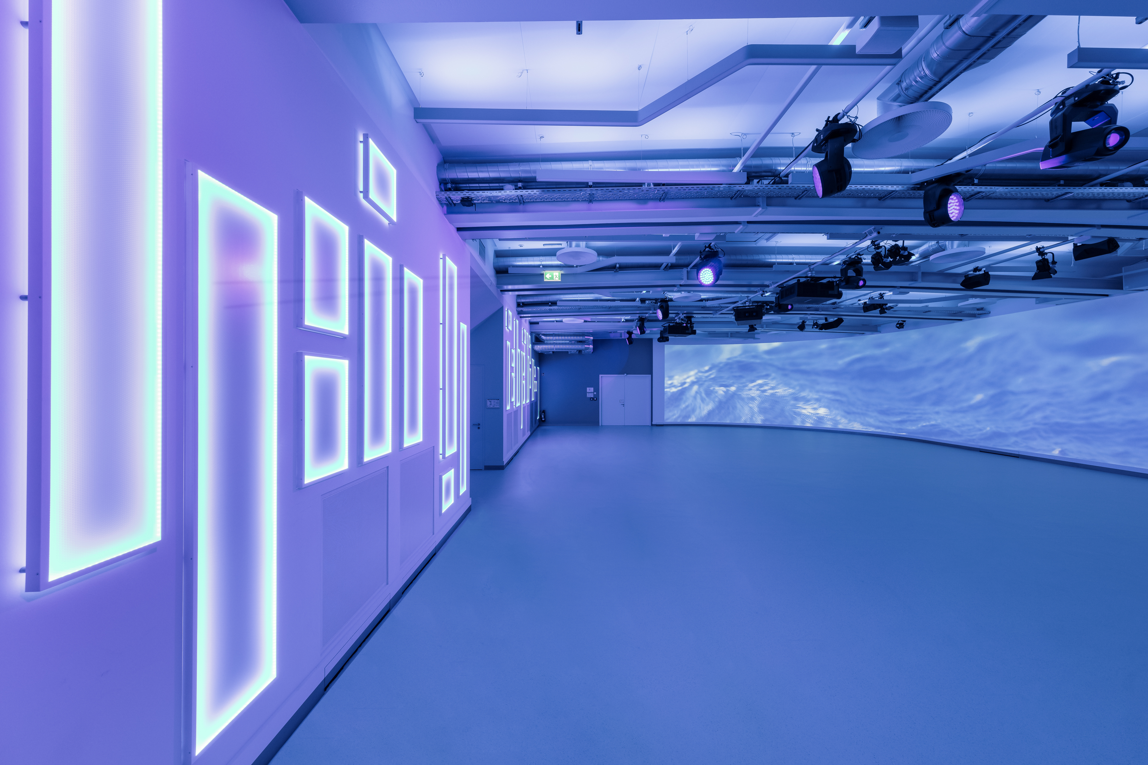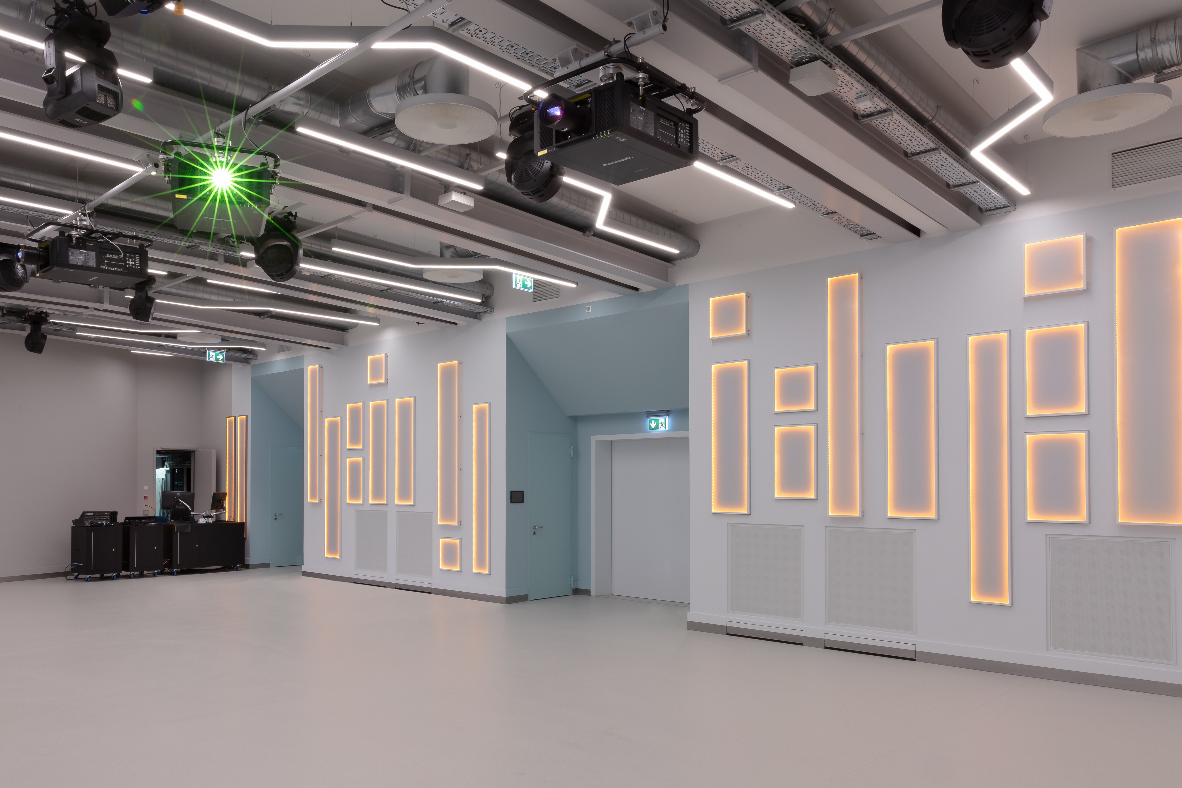 The CURVE heißt der neue Eventraum, welcher in einem ehemaligen Papierlager entstand. Highlight und Namensgeber ist eine gebogene Wand, die mit einer Fläche von 21x4 Metern beeindruckende Mega-Projektionen in gestochen scharfen Bildern ermöglicht. Da es diese spezielle Konstruktion nicht von der Stange gibt, wurde Jaeger Ausbau Würzburg mit dem Bau beauftragt. Grundlage ist eine gebogene GK-Ständerwand. Projektleiter Bernhard Bender: „Die kniffligste Aufgabe war die Anforderung ans Finish. Uns ist es durch äußert präzise Spachtelarbeiten gelungen, eine vollkommen ebene Oberfläche zu schaffen.“ Denn nur so erzielen die Bilder auch ihre gewünschte Wirkung. Auch die Akustikabsorber an Wänden und Decken wurden von Jaeger gebaut, genauso wie die trichterförmigen Lichtkuppelverkleidungen im rückseitigen Foyerbereich. Mit 150 cm Höhe und einer ovalen Grundform verlangten sie ebenfalls erstklassiges Handwerk von unseren Trockenbaumonteuren.