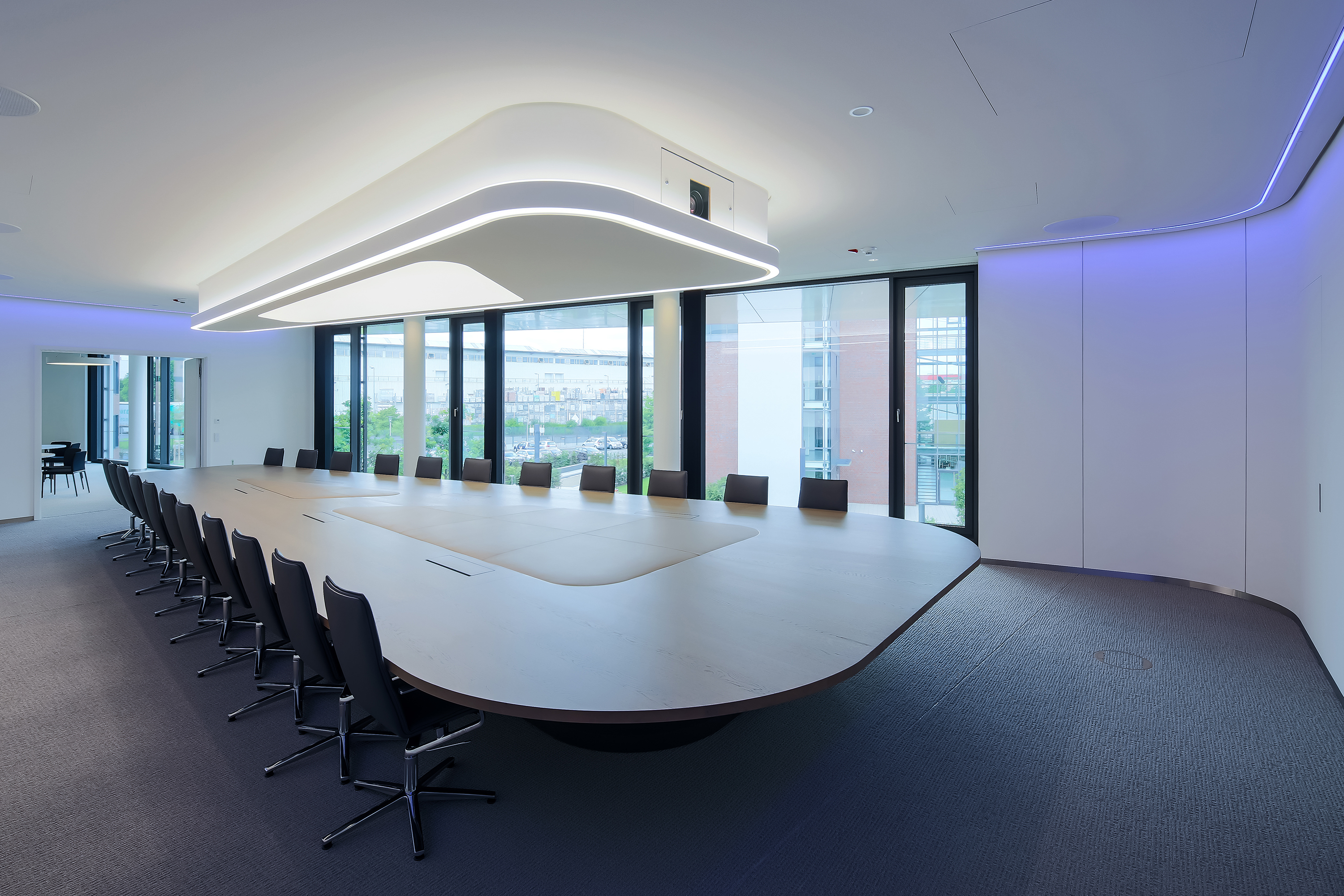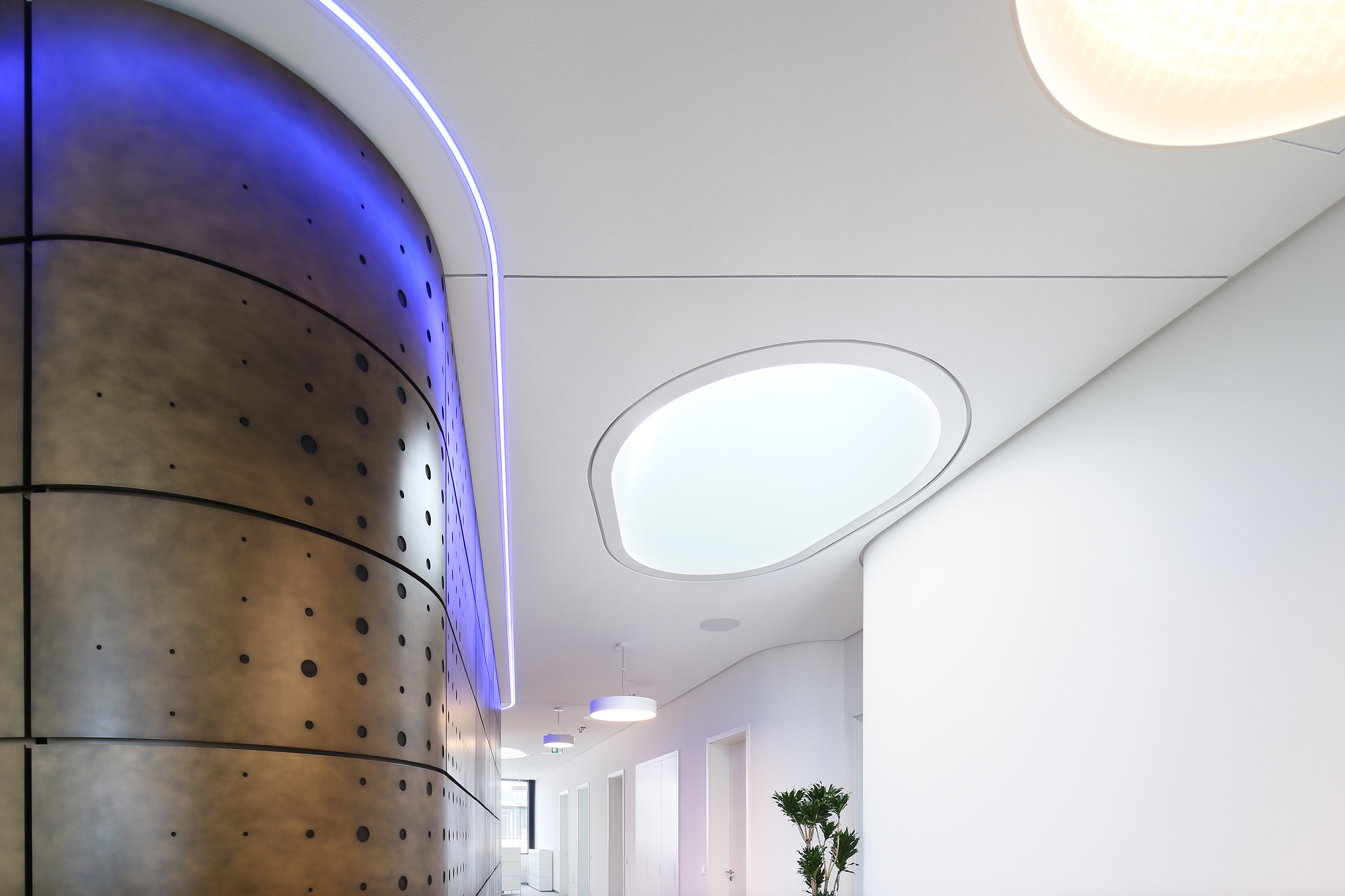 Der Bauherr legte großen Wert auf die Oberflächenqualität, insbesondere bei Streiflicht sowie bei einer Vielzahl von runden Randanschlüssen und geschwungenen Deckenversprüngen. Nicht ohne Stolz verweisen unsere Kollegen auch auf das einzigartige Beleuchtungssystem im Konferenzraum, welches von Jaeger Ausbau in seiner konischen und elliptischen Form konstruiert und gefertigt wurde. Viele der Räume im Gebäude wurden mit unserer Jaeger Systemwand geschaffen.