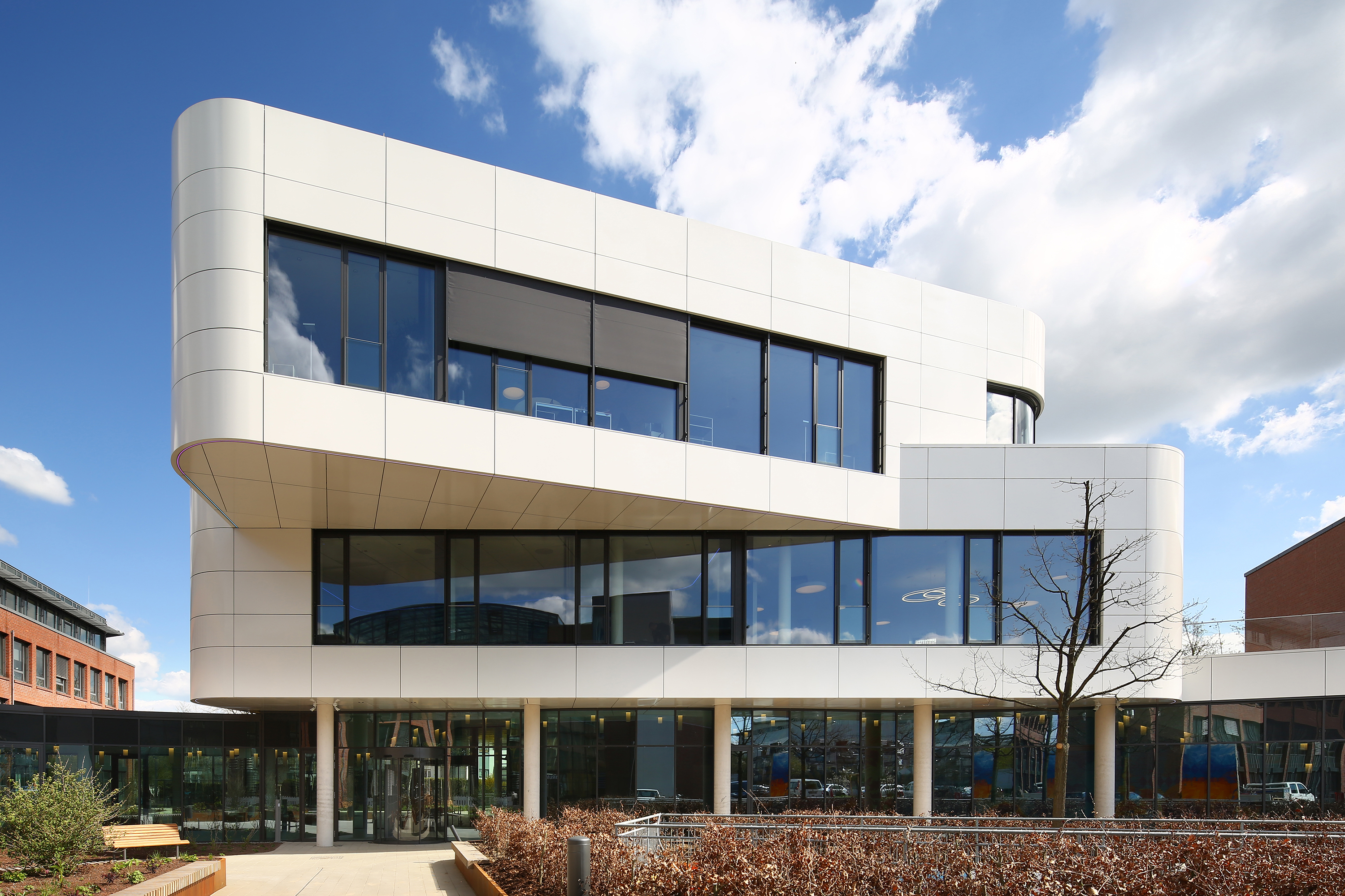 Der Erweiterungsbau der Volksbank Mittelhessen ist ein Hingucker – von außen wie von innen. Die neue Schaltzentrale besitzt zwei verdrehte Geschosse, in denen Konferenzräume und Vorstandsbereich untergebracht sind. Die Themenfelder Ökologie, Ökonomie, soziokulturelle und funktionale Aspekte, Technik, Prozesse und Standort wurden durch die Deutsche Gesellschaft für nachhaltiges Bauen (DGNB) bewertet und mit dem Zertifikat „Gold“ ausgezeichnet.