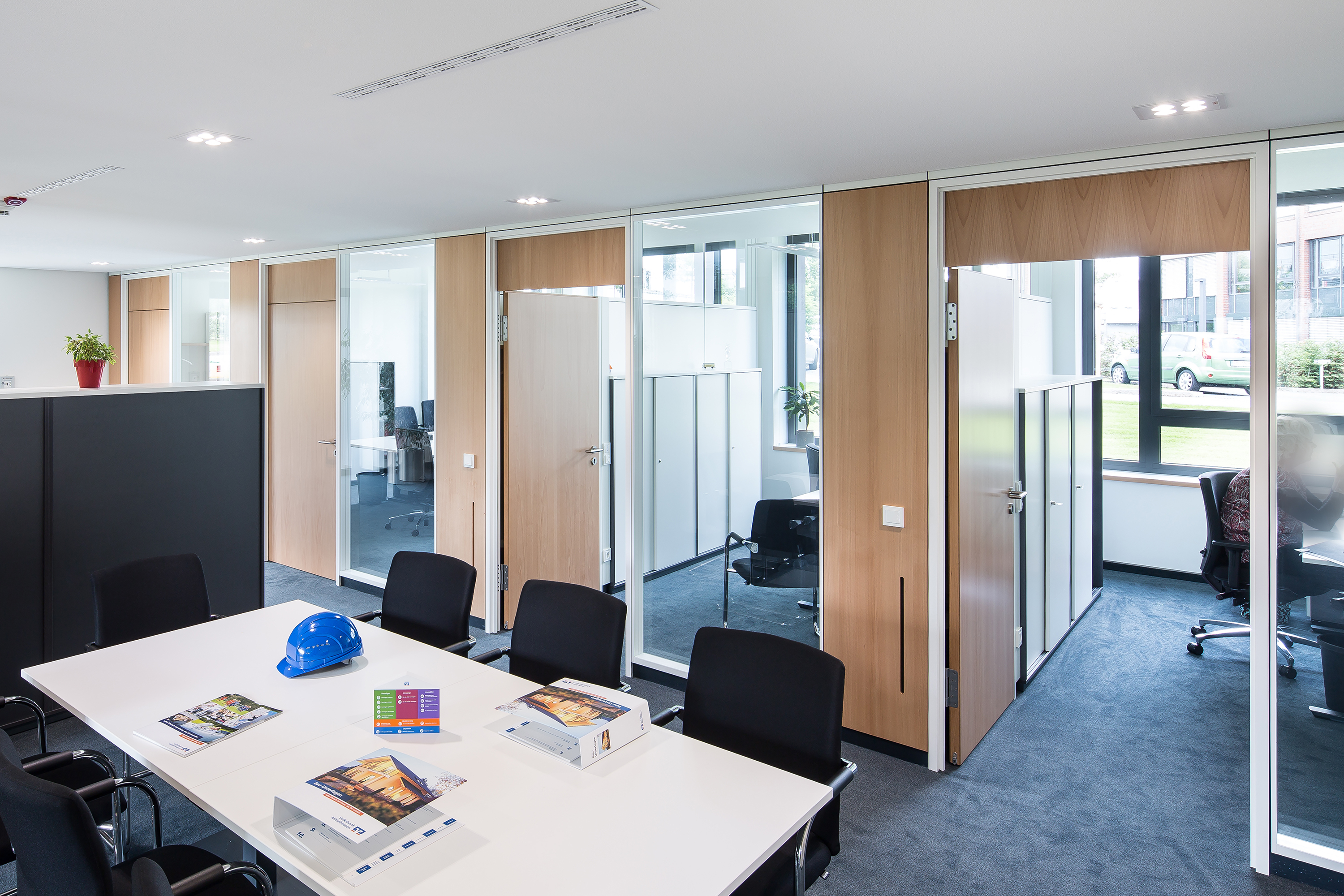 Geplant, gefertigt und montiert wurden Vollwände (SW 100) und verschiedene Glastrennwände sowohl mit Doppelverglasung (SW 100 GR) als auch die rahmenlose Einscheibenwand (SW 70 GE). Mehr zu unseren Systemwänden auf der nächsten Seite.