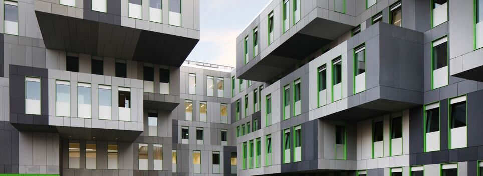 Mit der Fassade des Studierenden Service Center der Uni Köln ist dem Fassadenteam vom Standort Paderborn ein wahres Meisterstück gelungen. Der Neubau ist durch gestapelte Quader mit in Höhe undTiefe unregelmäßig positionierten Rücksprüngen und Auskragungen ein echter Hingucker. Die vorgehängte und hinterlüftete Fassade zieht sich um den gesamten Baukörper und bedeckt auch die Auf- und Untersichten der auskragenden Gebäudeteile. Die Fassade hat eine Gesamtfläche von 9.600 qm.