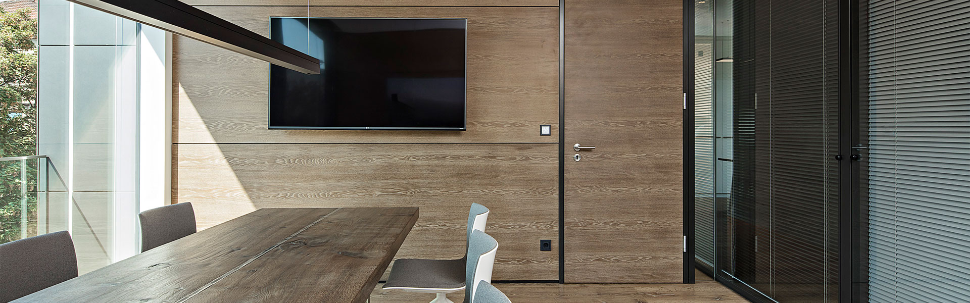 So schön kann eine Vollwand sein. Flexibilität und Langlebigkeit ist inklusive: Bei Nutzungsänderungen oder späteren Umbauten können die Unterkonstruktionen multifunktional für andere Vollwände sowie für unsere Glastrennwände verwendet werden.